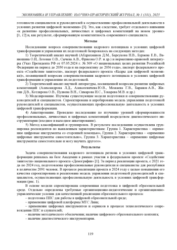 1. Абдрахманов Д.М. Совершенствование кадрового потенциала вьусловиях цифрового развития экономики / Д.М. Абдрахманов, И.В. Сергиенко, М.А. Крымова // Экономика и управление: научно-практический журнал. 2022. № 6 (168). С. 11-18.