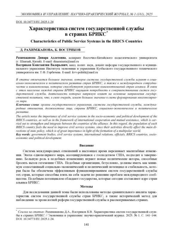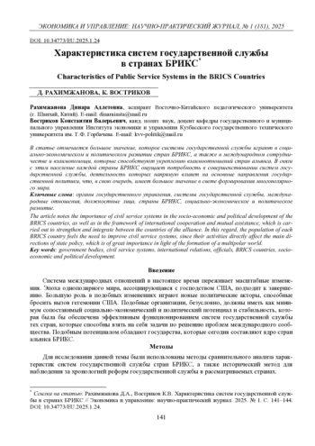 В статье отмечается большое значение, которое системы государственной службы играют в социально-экономическом и политическом развитии стран БРИКС, а также в международном сотрудничестве и взаимопомощи, которые способствуют укреплению взаимоотношений стран альянса. В связи с этим население каждой страны БРИКС ощущает потребность в совершенствовании систем государственной службы, деятельность которых напрямую влияет на основные направления государственной политики, что, в свою очередь, имеет большое значение в свете формирования многополярного мира