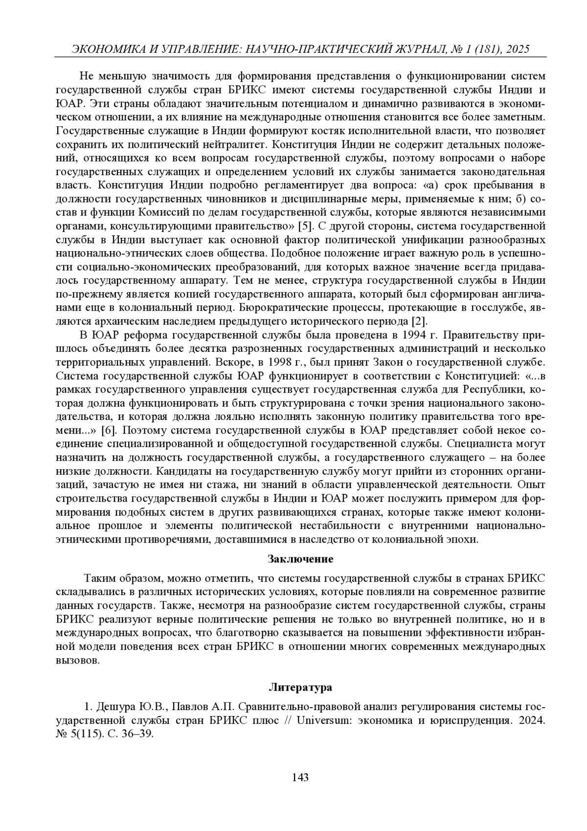 1. Дешура Ю.В., Павлов А.П. Сравнительно-правовой анализ регулирования системы государственной службы стран БРИКС плюс // Universum: экономика и юриспруденция. 2024. № 5(115). С. 36-39. EDN: DHFUOS