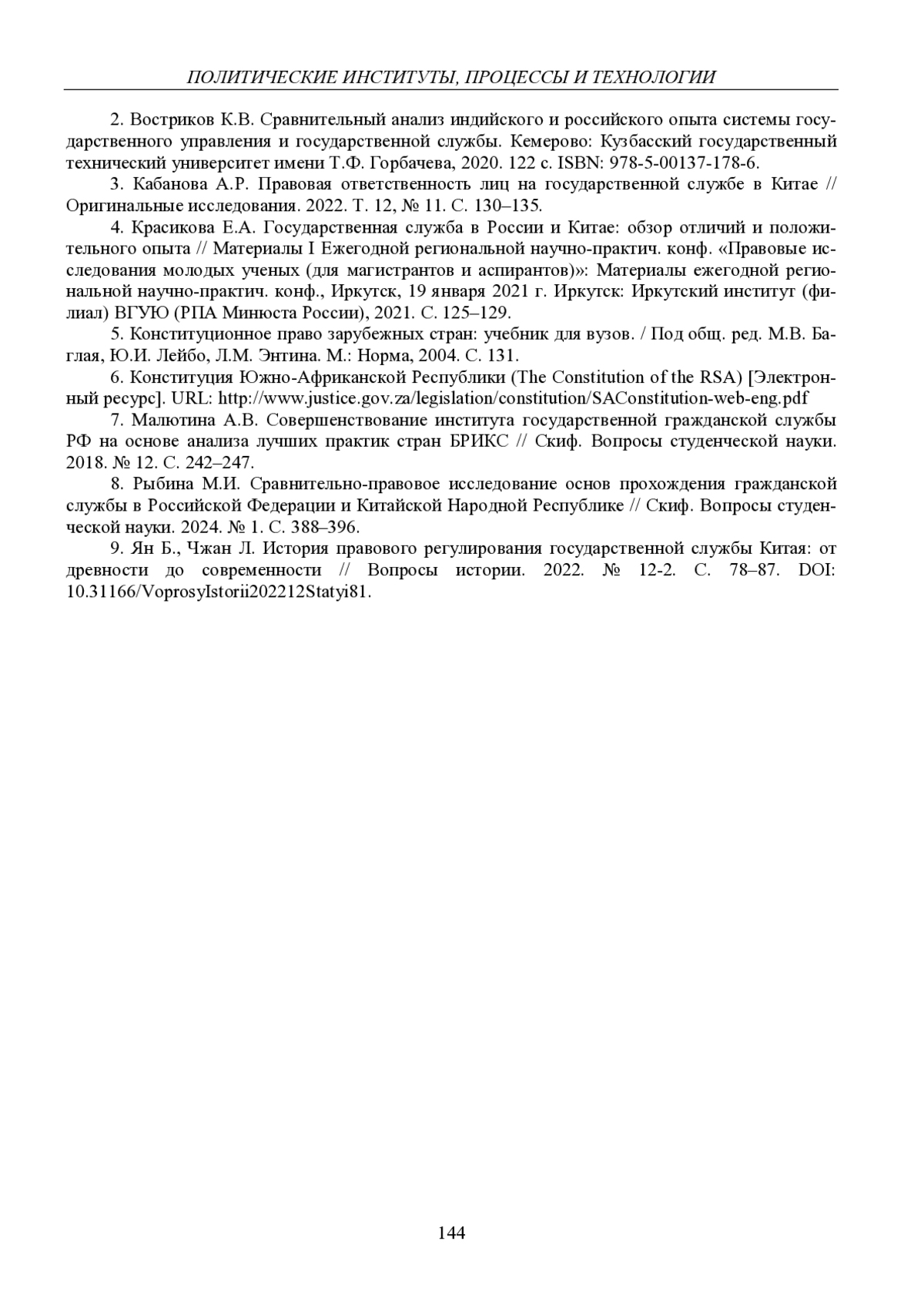 8. Рыбина М.И. Сравнительно-правовое исследование основ прохождения гражданской службы в Российской Федерации и Китайской Народной Республике // Скиф. Вопросы студенческой науки. 2024. № 1. С. 388-396. EDN: OVNIGZ