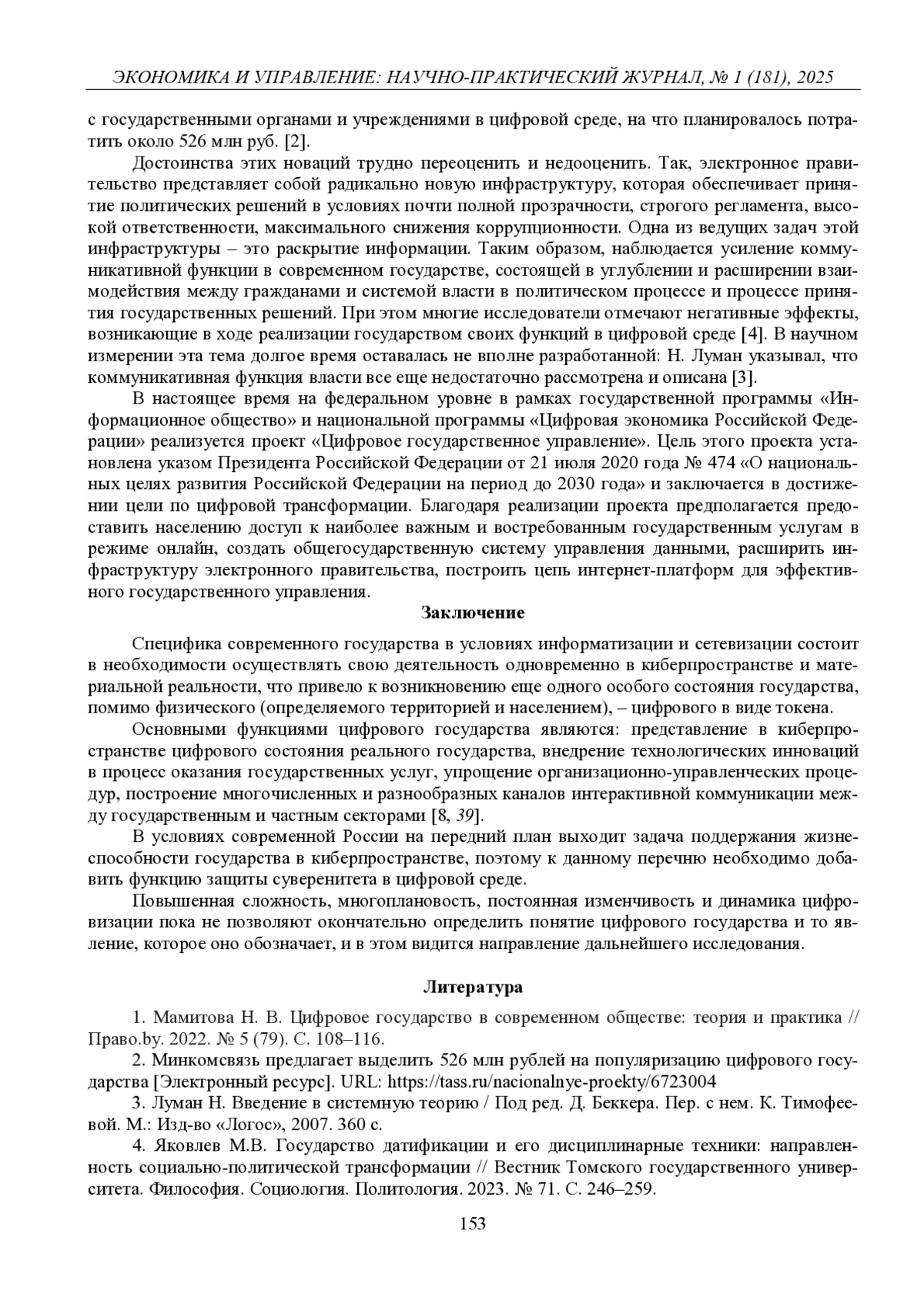 1. 	Мамитова Н. В. Цифровое государство в современном обществе: теория и практика // Право.by. 2022. № 5 (79). С. 108-116.  EDN: RTEGWF