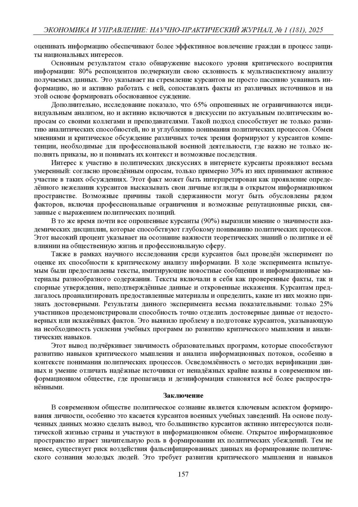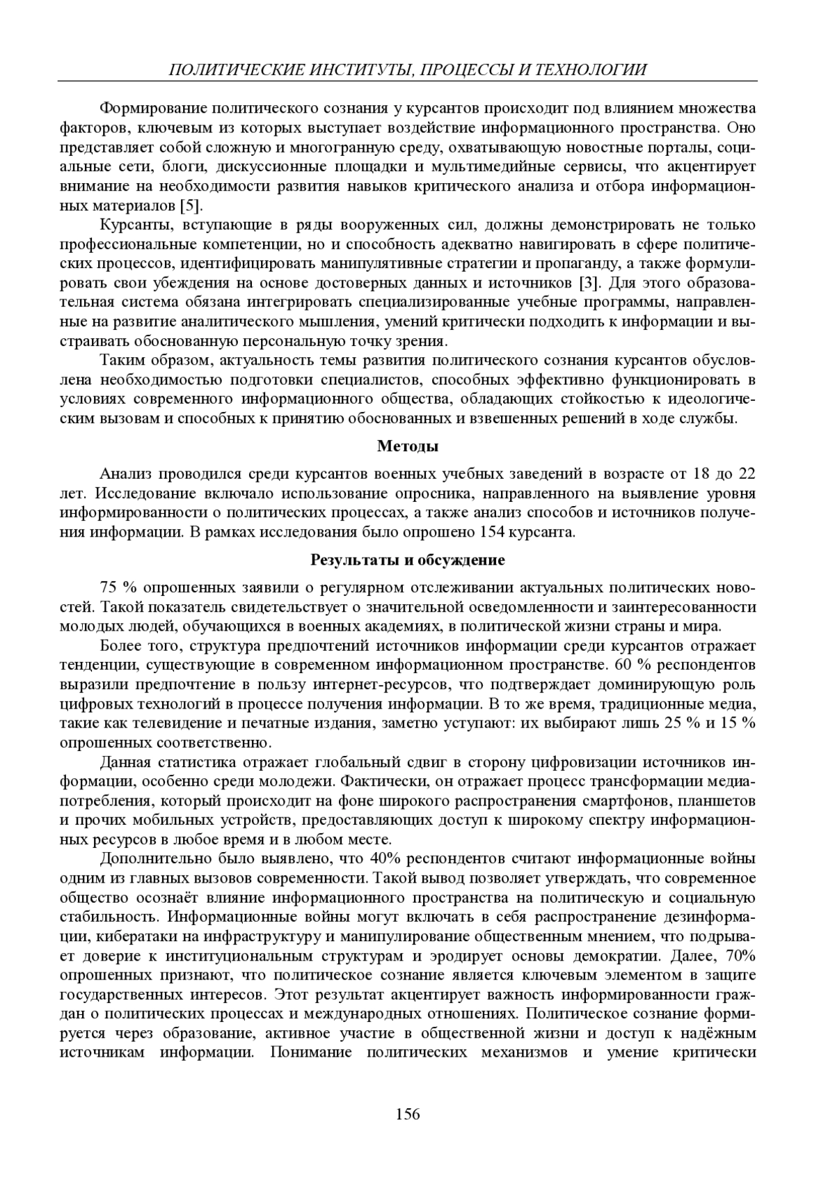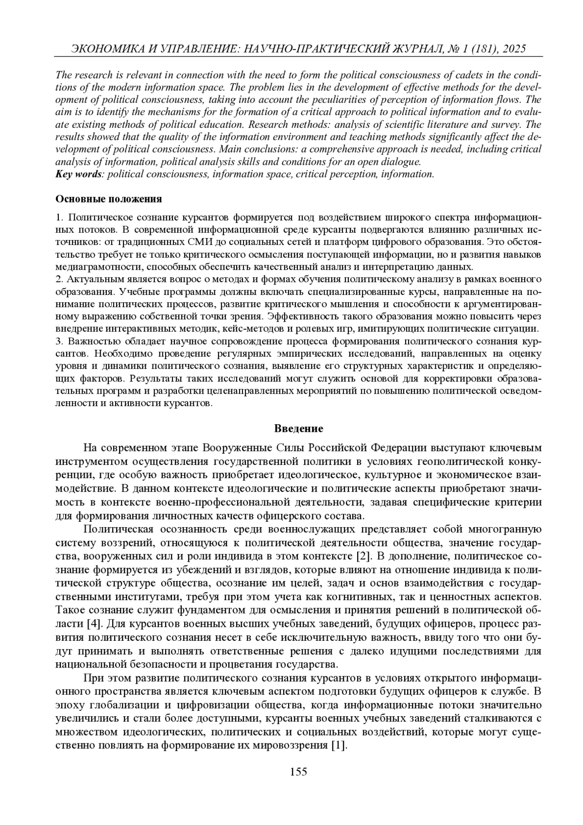 Исследование актуально в связи с необходимостью формирования политического сознания курсантов в условиях современного информационного пространства. Проблема заключается в разработке эффективных методов развития политического сознания, учитывая особенности восприятия информационных потоков. Цель – выявить механизмы формирования критического подхода к политической информации и оценить существующие методы политического образования. Методы исследования: анализ научной литературы и опрос. Результаты показали, что качество информационной среды и методы преподавания существенно влияют на развитие политического сознания. Основные выводы: необходим комплексный подход, включающий критический анализ информации, навыки политического анализа и условия для открытого диалога