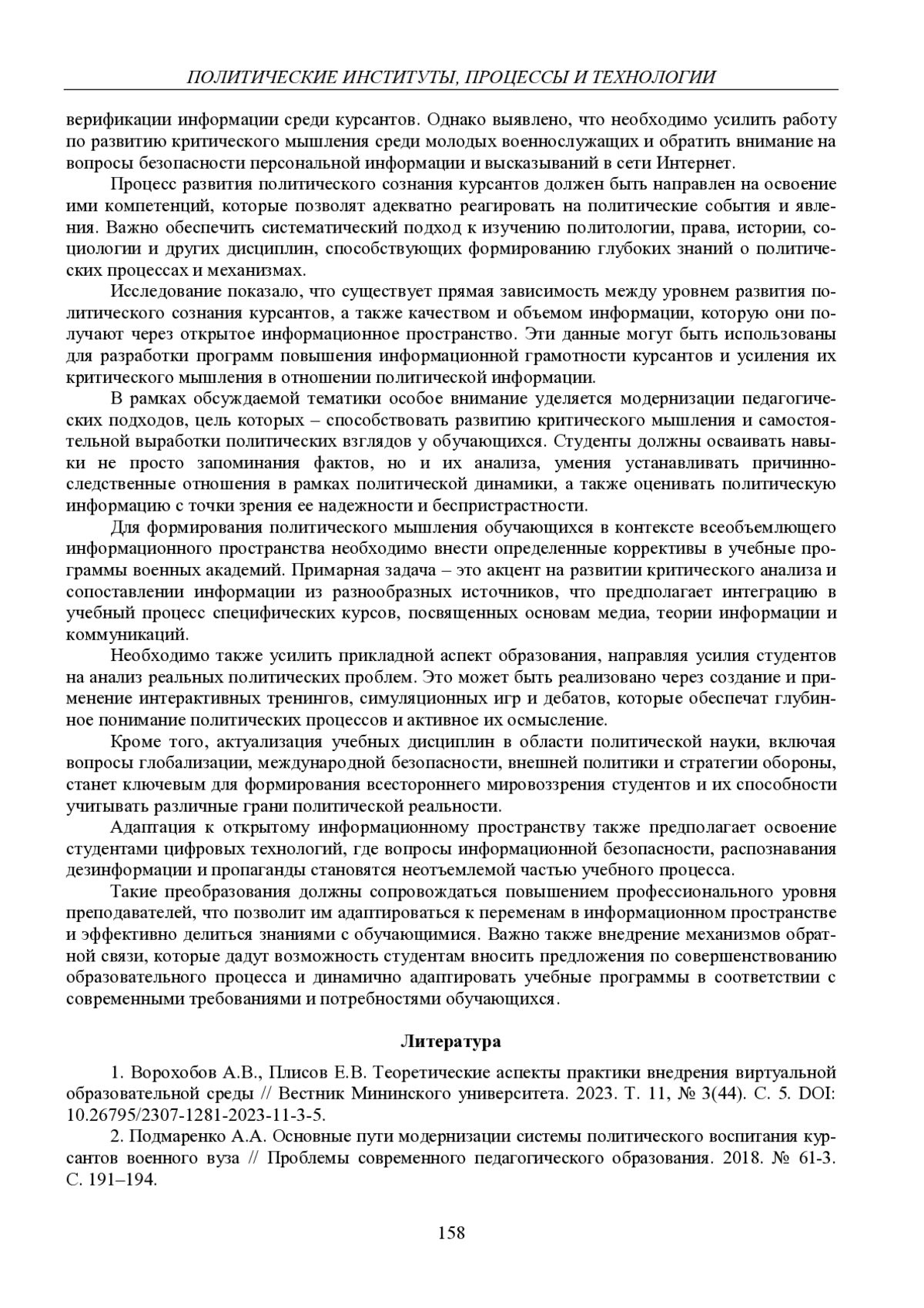 1. 	Ворохобов А.В., Плисов Е.В. Теоретические аспекты практики внедрения виртуальной образовательной среды // Вестник Мининского университета. 2023. Т. 11, № 3(44). С. 5.  DOI: 10.26795/2307-1281-2023-11-3-5  EDN: OMKOHM
