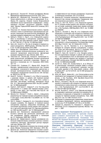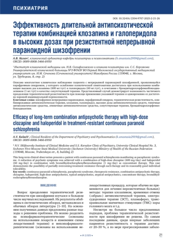 КАЛАЧ А. В. ЭФФЕКТИВНОСТЬ ДЛИТЕЛЬНОЙ АНТИПСИХОТИЧЕСКОЙ ТЕРАПИИ КОМБИНАЦИЕЙ КЛОЗАПИНА И ГАЛОПЕРИДОЛА В ВЫСОКИХ ДОЗАХ ПРИ РЕЗИСТЕНТНОЙ НЕПРЕРЫВНОЙ ПАРАНОИДНОЙ ШИЗОФРЕНИИ // СОВРЕМЕННАЯ ТЕРАПИЯ В ПСИХИАТРИИ И НЕВРОЛОГИИ. 2025. № 2