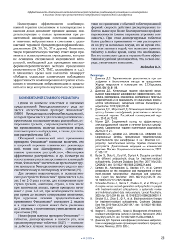 Статья: ЭФФЕКТИВНОСТЬ ДЛИТЕЛЬНОЙ АНТИПСИХОТИЧЕСКОЙ ТЕРАПИИ КОМБИНАЦИЕЙ КЛОЗАПИНА И ГАЛОПЕРИДОЛА В ВЫСОКИХ ДОЗАХ ПРИ РЕЗИСТЕНТНОЙ НЕПРЕРЫВНОЙ ПАРАНОИДНОЙ ШИЗОФРЕНИИ (2025)