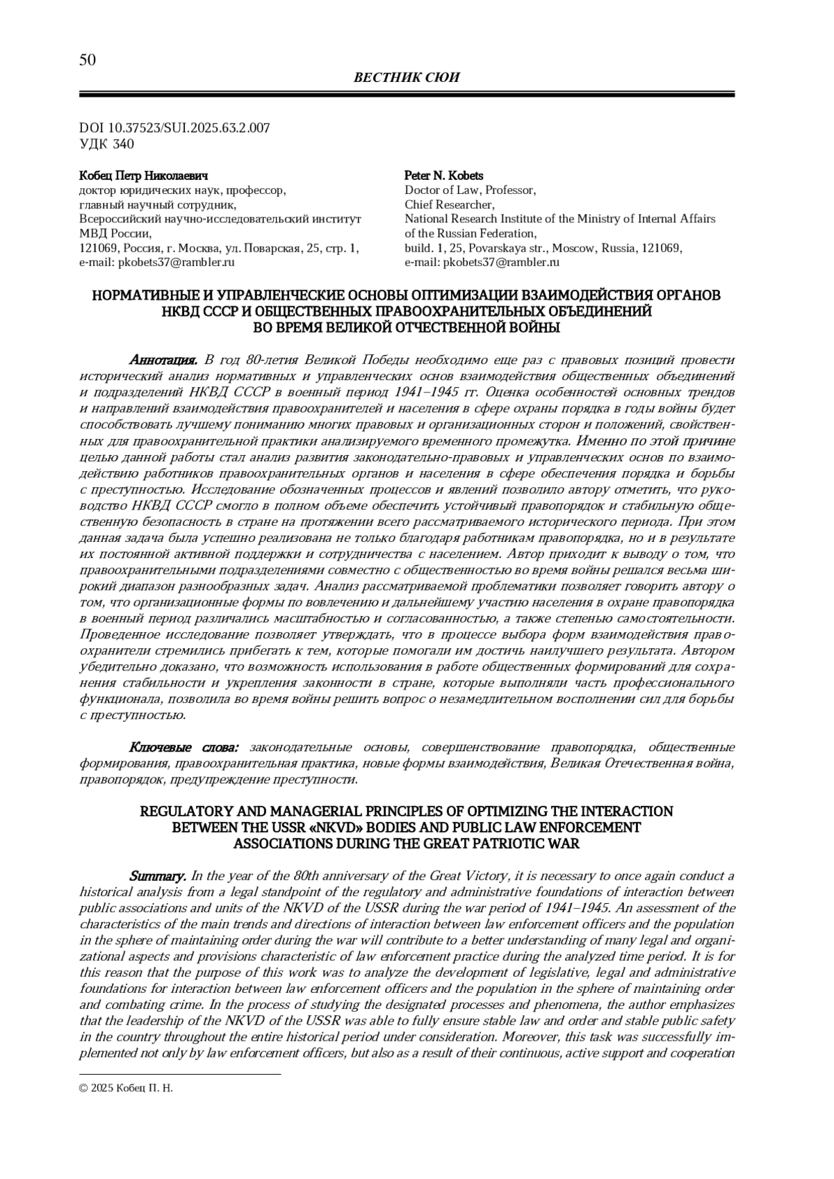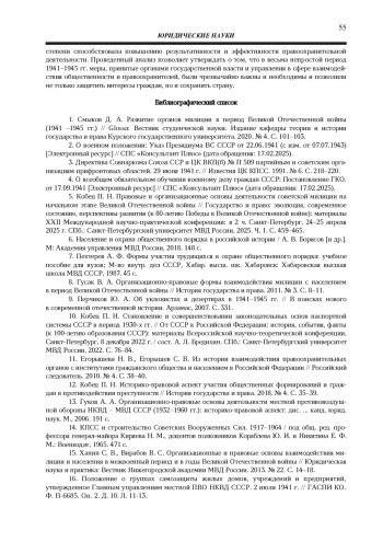 5. 	Кобец П. Н. Правовые и организационные основы деятельности советской милиции на начальном этапе Великой Отечественной войны // Государство и право: эволюция, современное состояние, перспективы развития (к 80-летию Победы в Великой Отечественной войне): материалы XXII Международной научно-практической конференции: в 2 ч. Санкт-Петербург, 24-25 апреля 2025 г. СПб.: Санкт-Петербургский университет МВД России, 2025. Ч. 1. С. 459-465. EDN: CJQAXJ