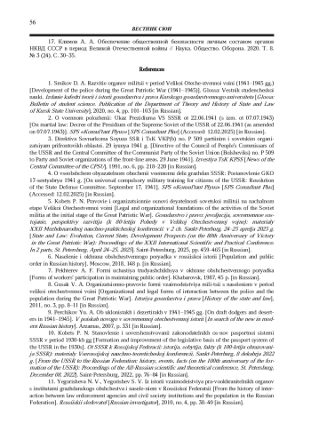 17. 	Климов А. А. Обеспечение общественной безопасности личным составом органов НКВД СССР в период Великой Отечественной войны // Наука. Общество. Оборона. 2020. Т. 8. № 3 (24). С. 30-35. EDN: HLSSVI