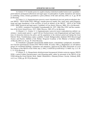 12. 	Кобец П. Н. Историко-правовой аспект участия общественных формирований и граждан в противодействии преступности // История государства и права. 2018. № 4. С. 35-39. EDN: YWESPU