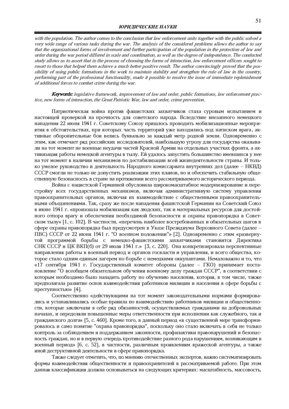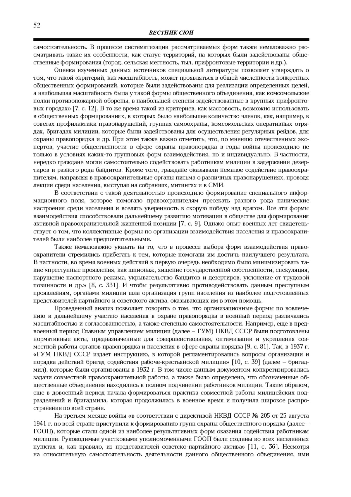 8. 	Гусак В. А. Организационно-правовые формы взаимодействия милиции с населением в период Великой Отечественной войны // История государства и права. 2011. № 3. С. 8-11. EDN: NTLKFV