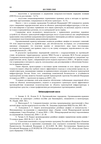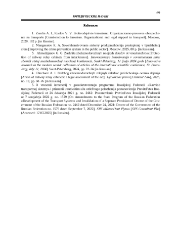1. 	Землин А. И., Козлов В. В. Противодействие терроризму. Организационно-правовое обеспечение на транспорте: учебное пособие для бакалавриата, специалитета и магистратуры. М.: Юрайт, 2020. 182 с. EDN: RZATHC