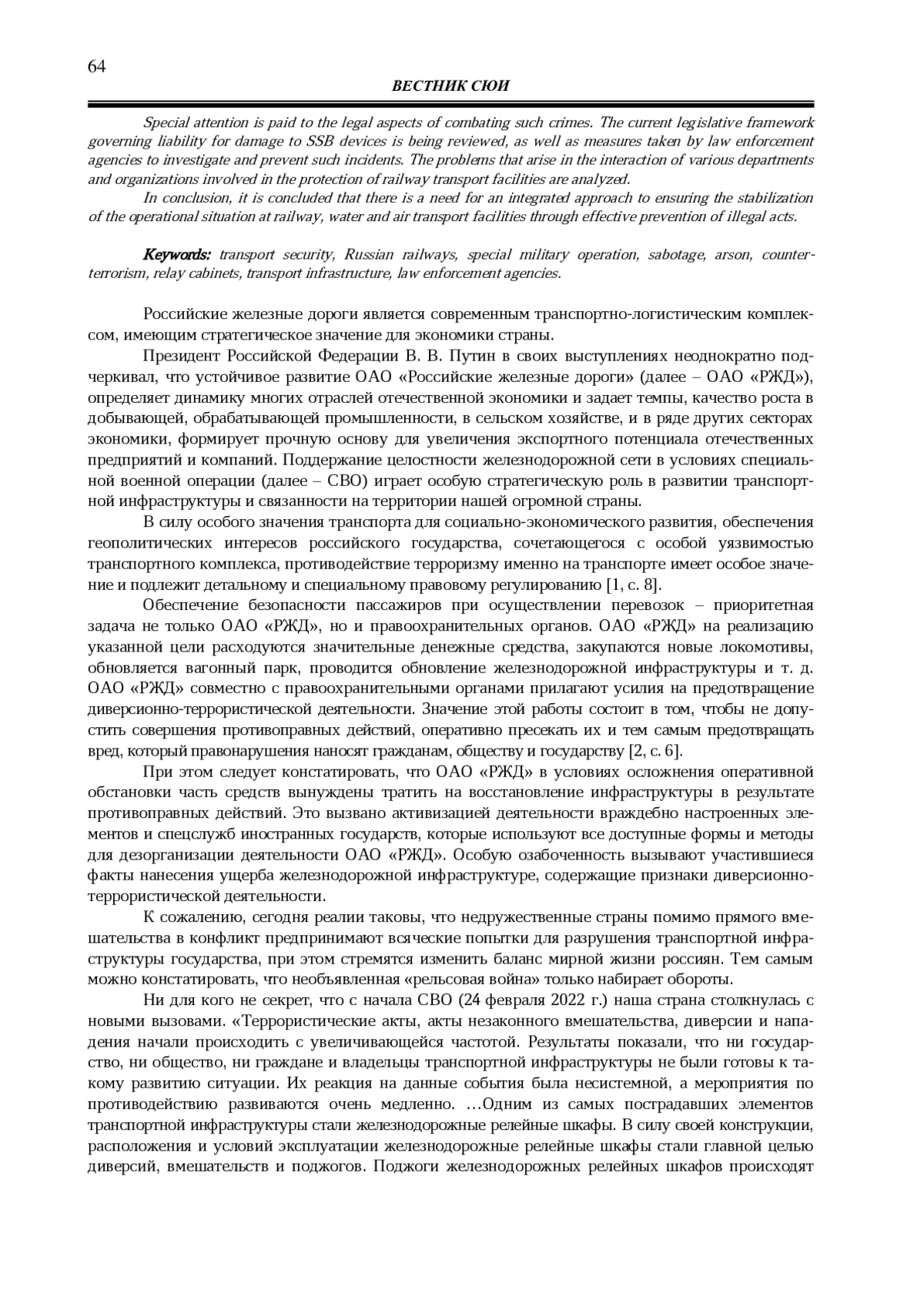 Статья рассматривает современное состояние противодействия противоправным действиям, направленным на повреждение устройств сигнализации, централизации и блокировки (СЦБ) на объектах железнодорожного транспорта. Эти устройства играют ключевую роль в обеспечении безопасности движения поездов и предотвращении аварийных ситуаций. Повреждение СЦБ-оборудования может привести к серьезным последствиям, включая катастрофы с многочисленными жертвами и значительным материальным ущербом.