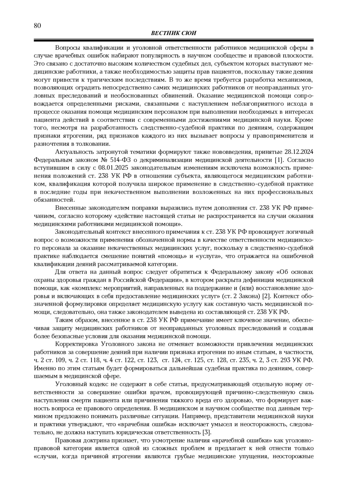 Актуальность затронутой темы формирует не только наличие неопределенности, которая сопровождает название и признаки этой группы деяний, но и основания процесса их криминализации (общественной опасности), особенности специальной противоправности, как признака преступления. В работе автор последовательно анализирует внесенные Федеральным законом от 08.12.2024 № 514-ФЗ нововведения в уголовное законодательство, исключившие возможность применения положений ст. 238 УК РФ на случаи оказания медицинскими работниками медицинской помощи.