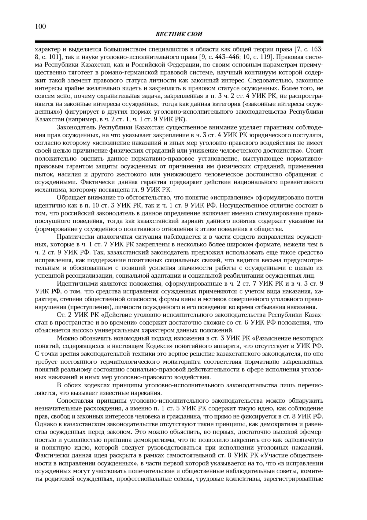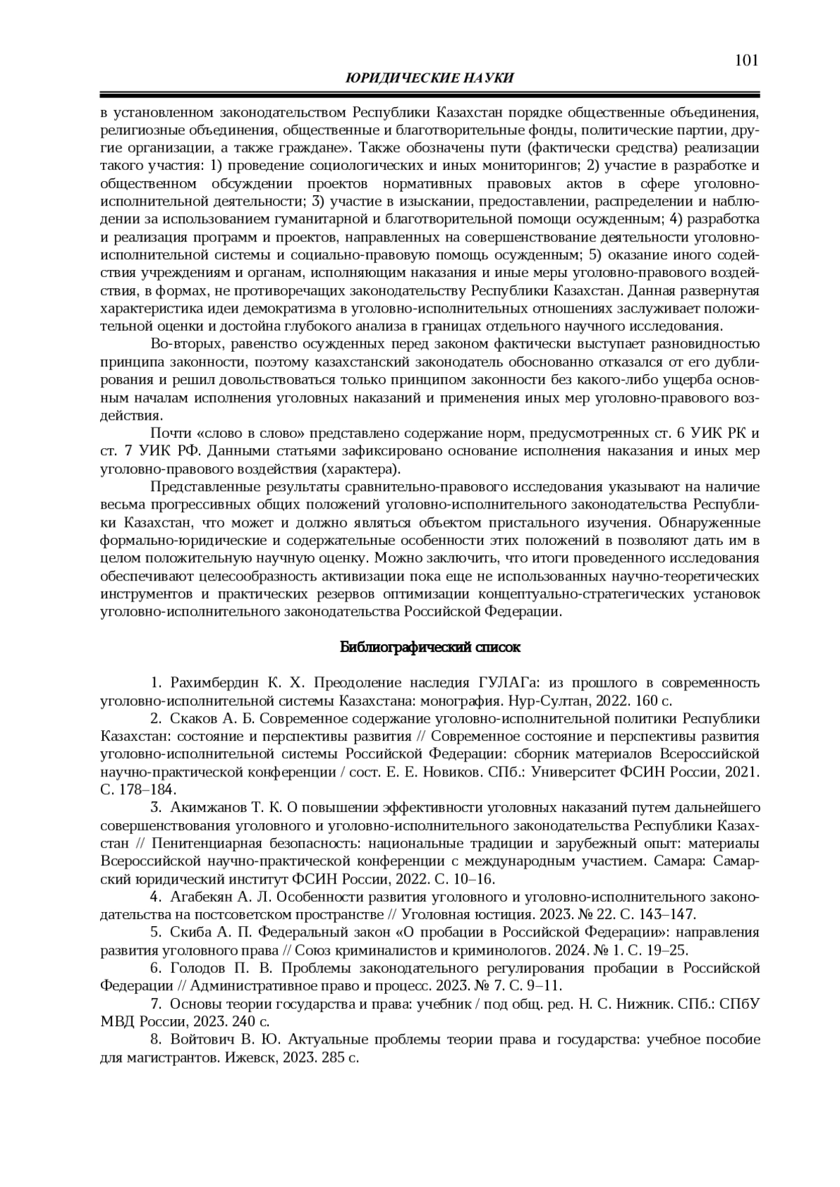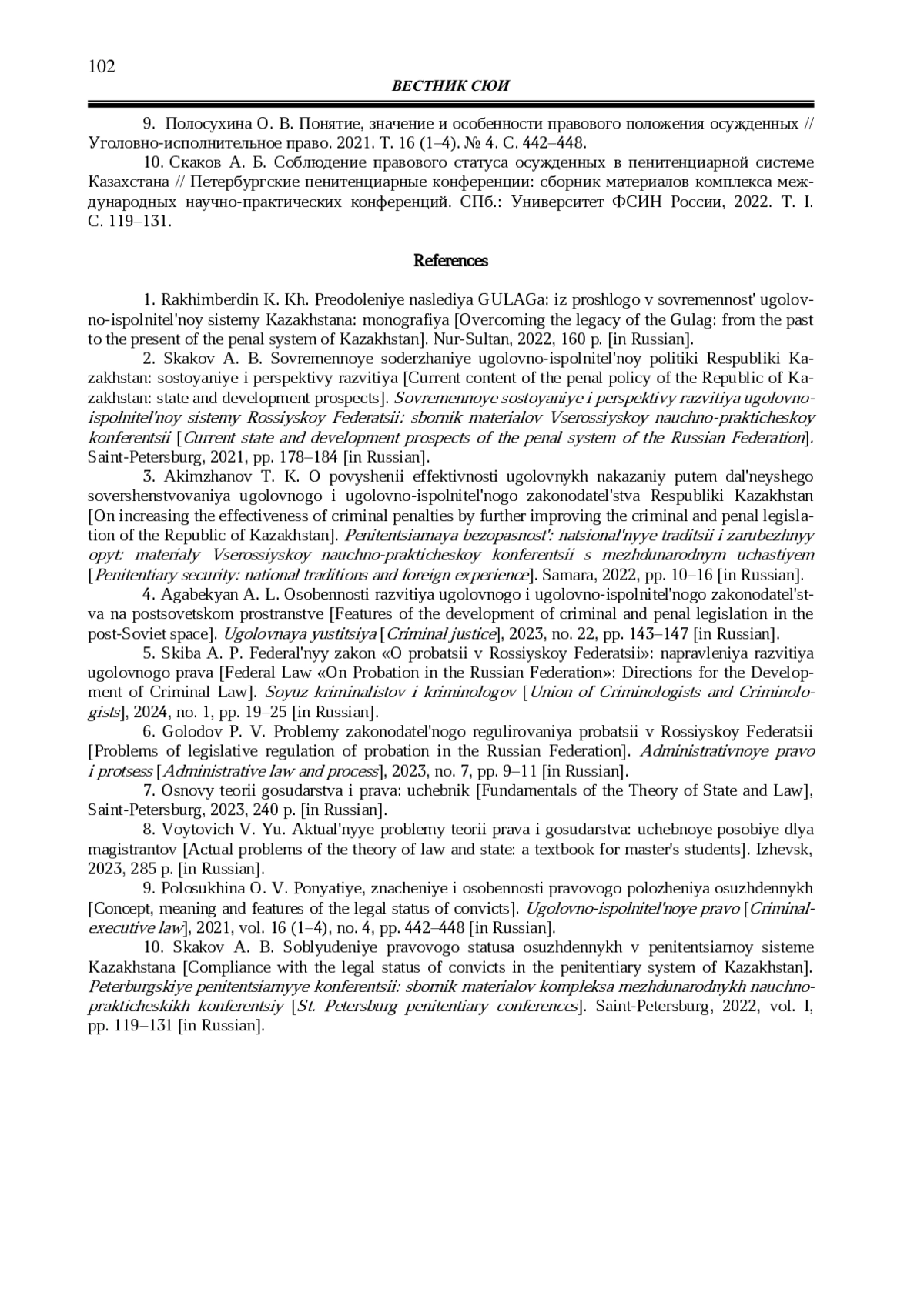 10. 	Скаков А. Б. Соблюдение правового статуса осужденных в пенитенциарной системе Казахстана // Петербургские пенитенциарные конференции: сборник материалов комплекса международных научно-практических конференций. СПб.: Университет ФСИН России, 2022. Т. I. С. 119-131. EDN: FWTZAQ