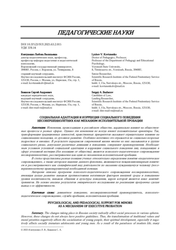 В результате парадоксов современной жизни многие из них оказываются в группе социального риска, допускают различные девиации в поведении, совершают правонарушения. Необходимым условием успешной социальной адаптации и коррекции социального поведения лиц, попадающих в сферу уголовной юстиции (без изоляции от общества), является психолого-педагогическое сопровождение несовершеннолетних, рассматриваемое как один из механизмов исполнительной пробации.