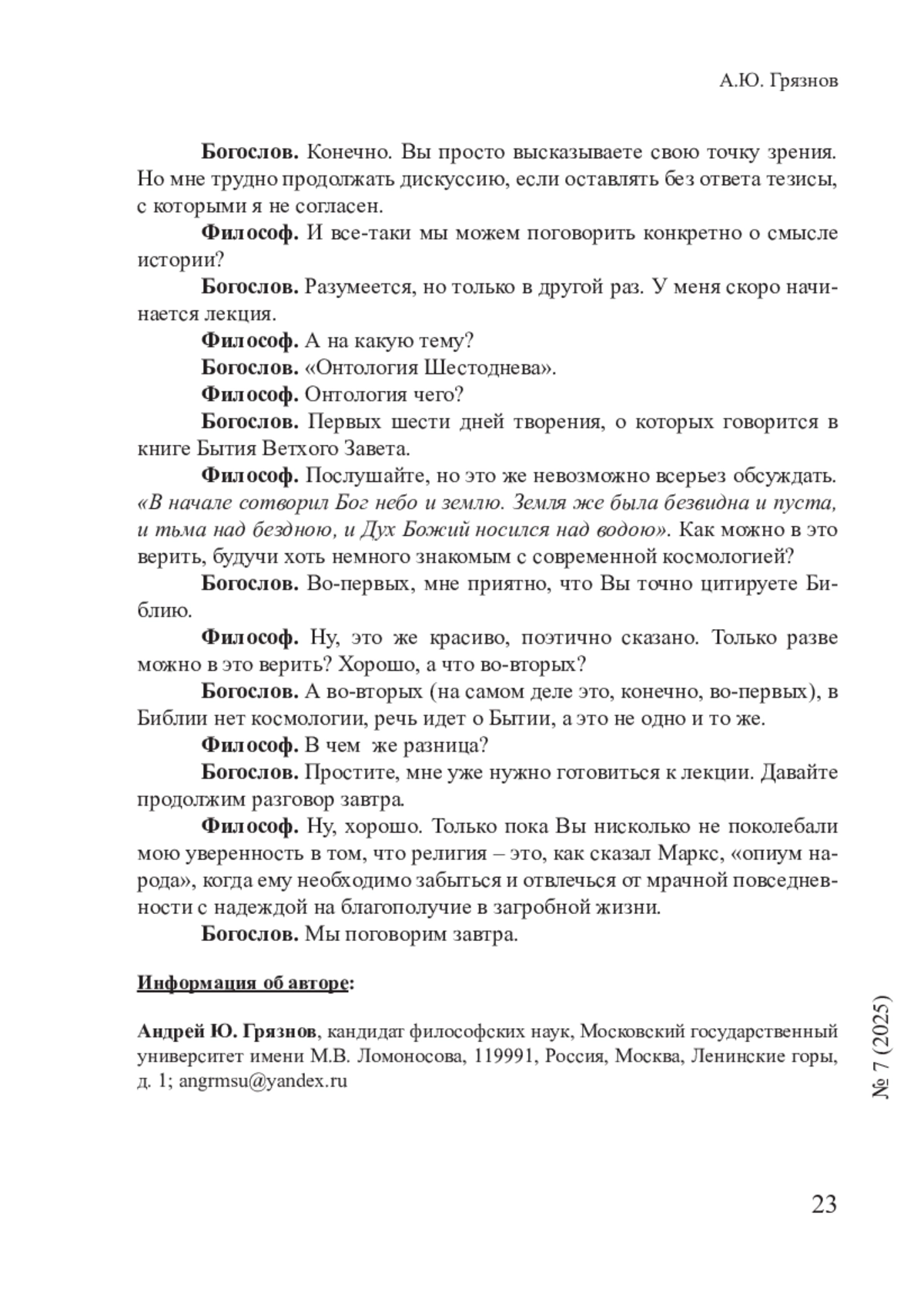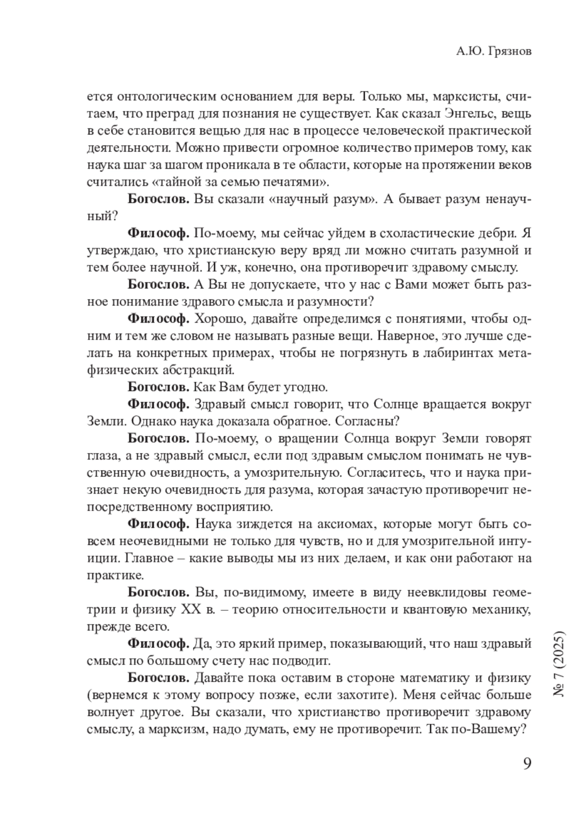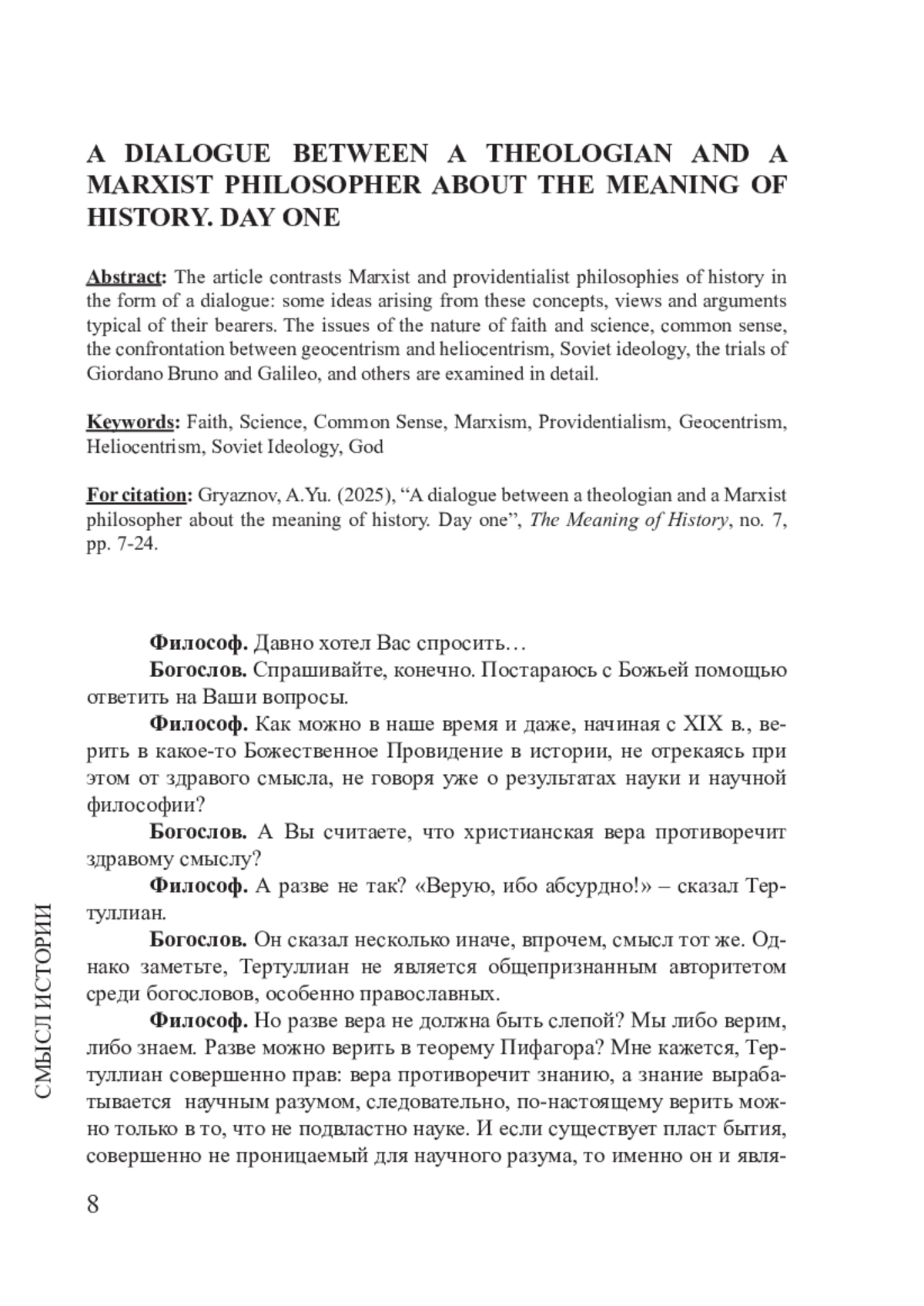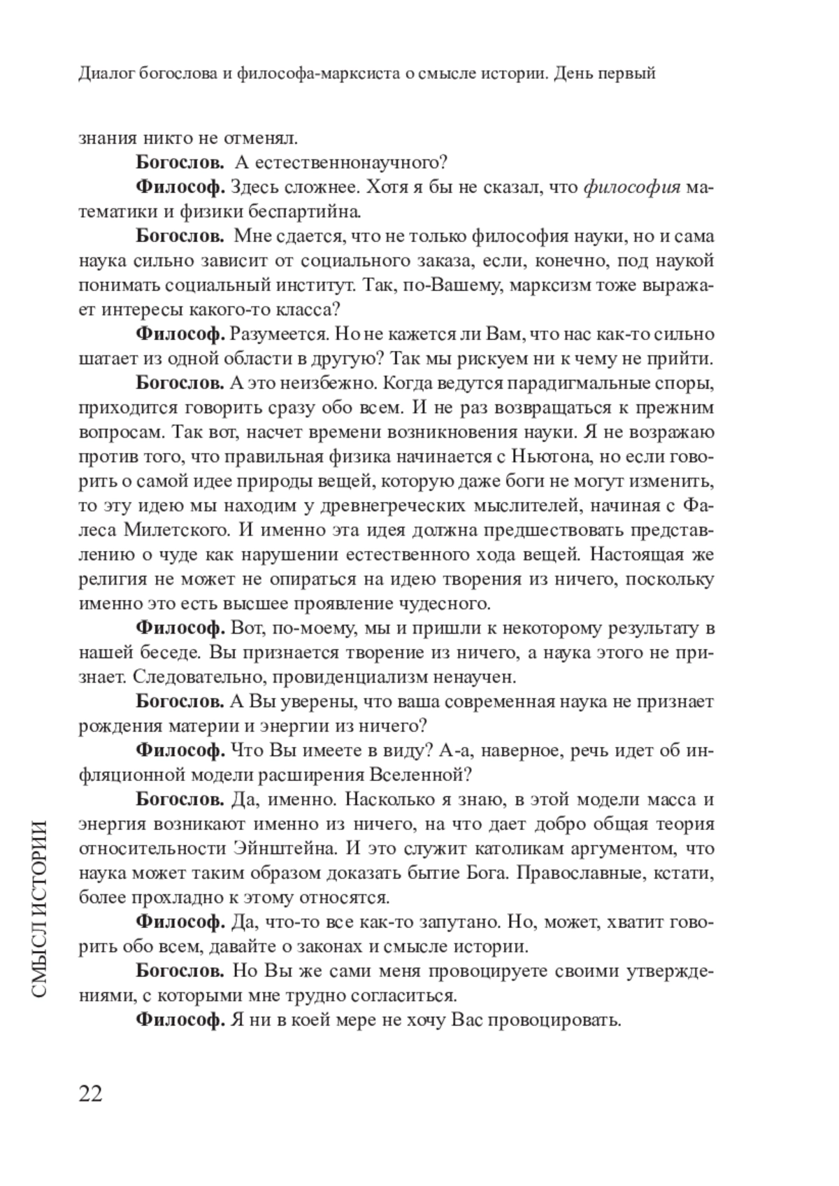 В статье в форме диалога противопоставляются марксистская и провиденциалистская философии истории: некоторые вытекающие из данных концепций представления, типичные для их носителей взгляды и аргументы. Подробно рассмотрены вопросы о сущности веры и науки, здравом смысле, противостоянии геоцентризма и гелиоцентризма, советской идеологии, судебных процессах над Джордано Бруно и Галилеем и др.