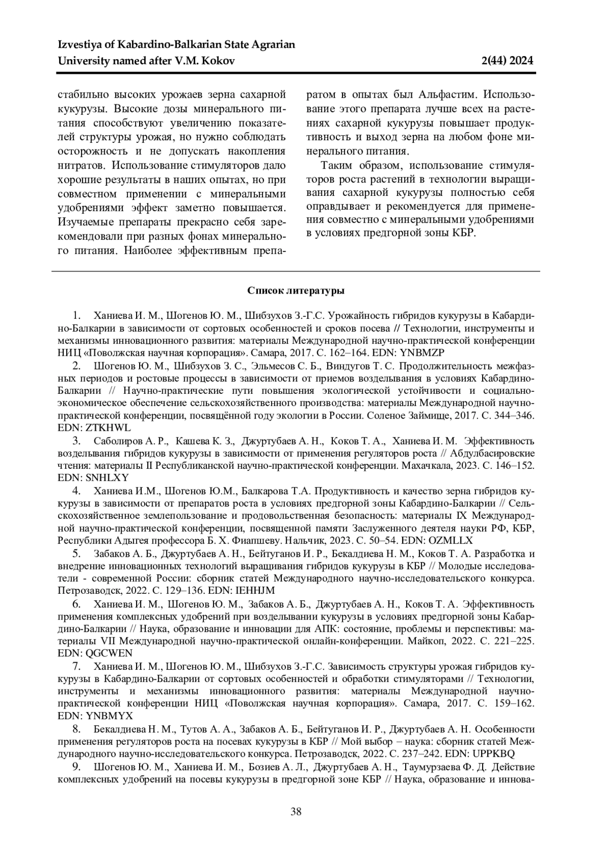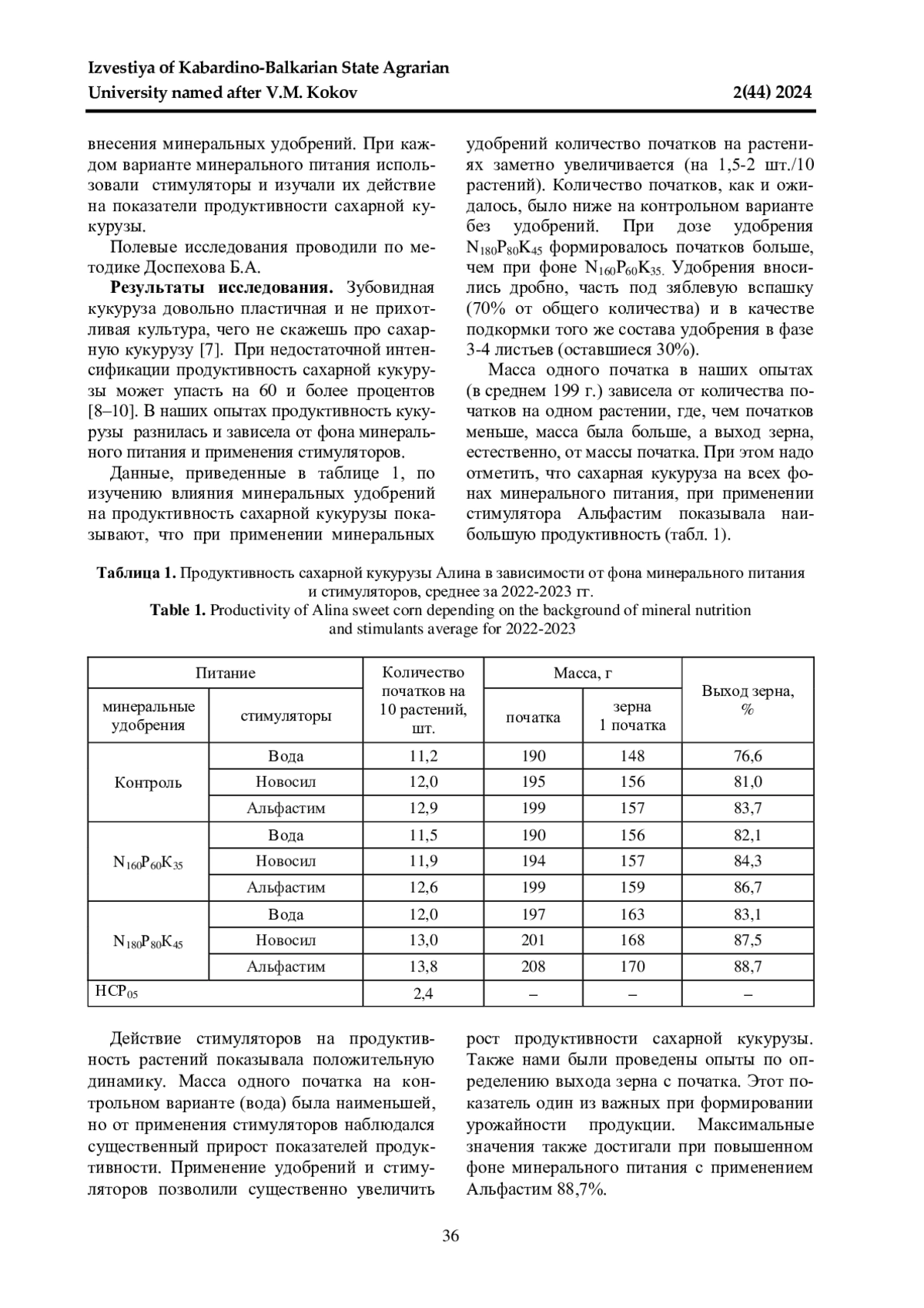 ШИБЗУХОВ З. С. ПРОДУКТИВНОСТЬ САХАРНОЙ КУКУРУЗЫ ПРИ РАЗЛИЧНОМ ФОНЕ МИНЕРАЛЬНОГО ПИТАНИЯ С ИСПОЛЬЗОВАНИЕМ СТИМУЛЯТОРОВ РОСТА РАСТЕНИЙ // ИЗВЕСТИЯ КАБАРДИНО-БАЛКАРСКОГО ГОСУДАРСТВЕННОГО АГРАРНОГО УНИВЕРСИТЕТА ИМ. В. М. КОКОВА. 2024. № 2 (44)