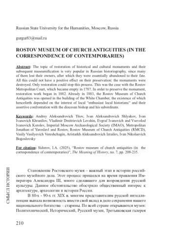 Тема восстановления памятников истории и культуры и позднейшей их музеефикации весьма популярна в русской историографии, поскольку многие из них теряли своих владельцев, после чего фактически были брошены на произвол судьбы. Все это не могло положительно сказаться на их сохранности: памятники разрушались. Остановить данный процесс могла только реставрация. Так было и с Ростовским митрополичьим двором, который опустел в 1787 г. Дабы сохранить памятник, в 1882 г. были начаты реставрационные работы. Уже в 1883 г. в здании Белой палаты открыли Ростовский музей церковных древностей, существование которого зависело впредь от заинтересованности в этом местных «краеведов-энтузиастов» и их напористого противоборства с епархиальным владыкой и его подчиненным.