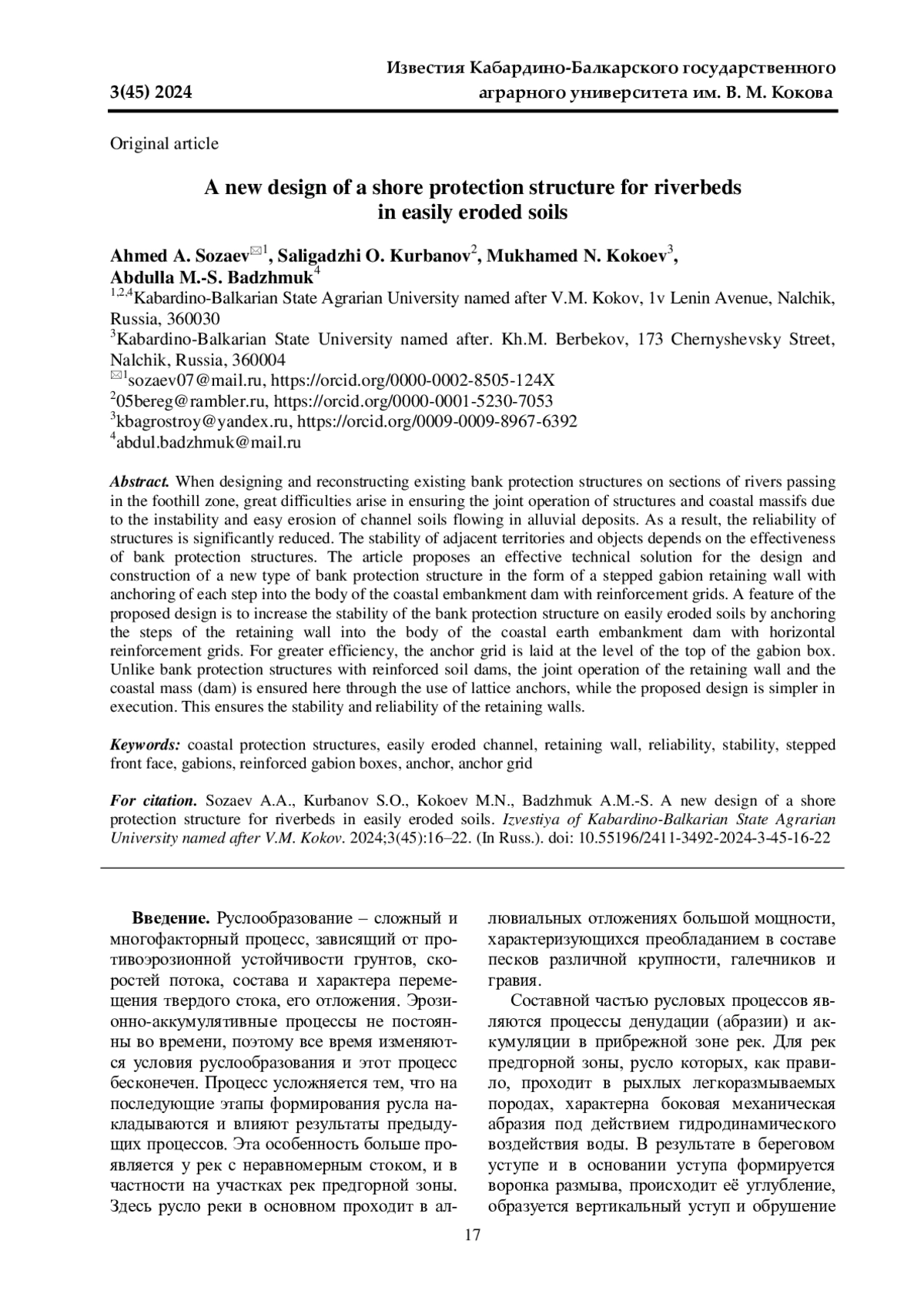 При проектировании и реконструкции существующих берегоукрепительных сооружений на участках рек, проходящих в предгорной зоне, возникают большие сложности с обеспечением совместной работы сооружений и береговых массивов из-за неустойчивости и легкоразмываемости грунтов русла, протекающих в аллювиальных отложениях. В результате существенно снижается надежность сооружений. От эффективности работы берегозащитных сооружений зависит устойчивость прилегающих территорий и объектов. В статье предлагается эффективное техническое решение по проектированию и строительству нового типа берегоукрепительного сооружения в виде ступенчатой габионной подпорной стенки с анкерованием каждой ступени в тело прибрежной насыпной грунтовой дамбы арматурными решетками. Особенностью предлагаемой конструкции является повышение устойчивости берегоукрепительного сооружения на легкоразмываемых грунтах путем анкерования ступеней подпорной стенки в тело прибрежной насыпной грунтовой дамбы горизонтальными арматурными решетками. Для большей эффективности анкерная решетка укладывается на уровне верха габионного ящика. В отличие от берегоукрепительных сооружений с армогрунтовыми дамбами здесь обеспечивается совместная работа подпорной стенки и берегового массива (дамбы) за счет применения решетчатых анкеров, при этом предлагаемая конструкция проще в исполнении. Тем самым обеспечивается устойчивость и надежность работы подпорных стен.