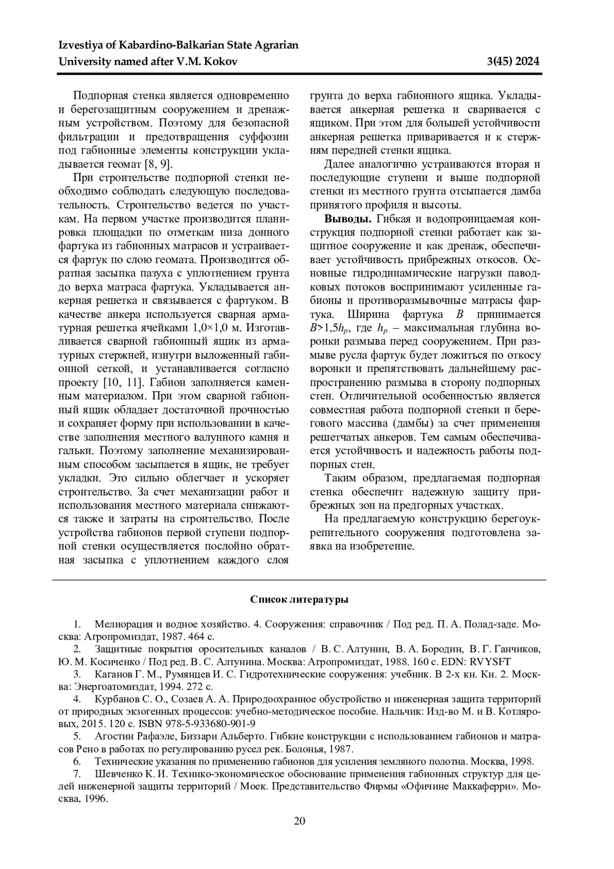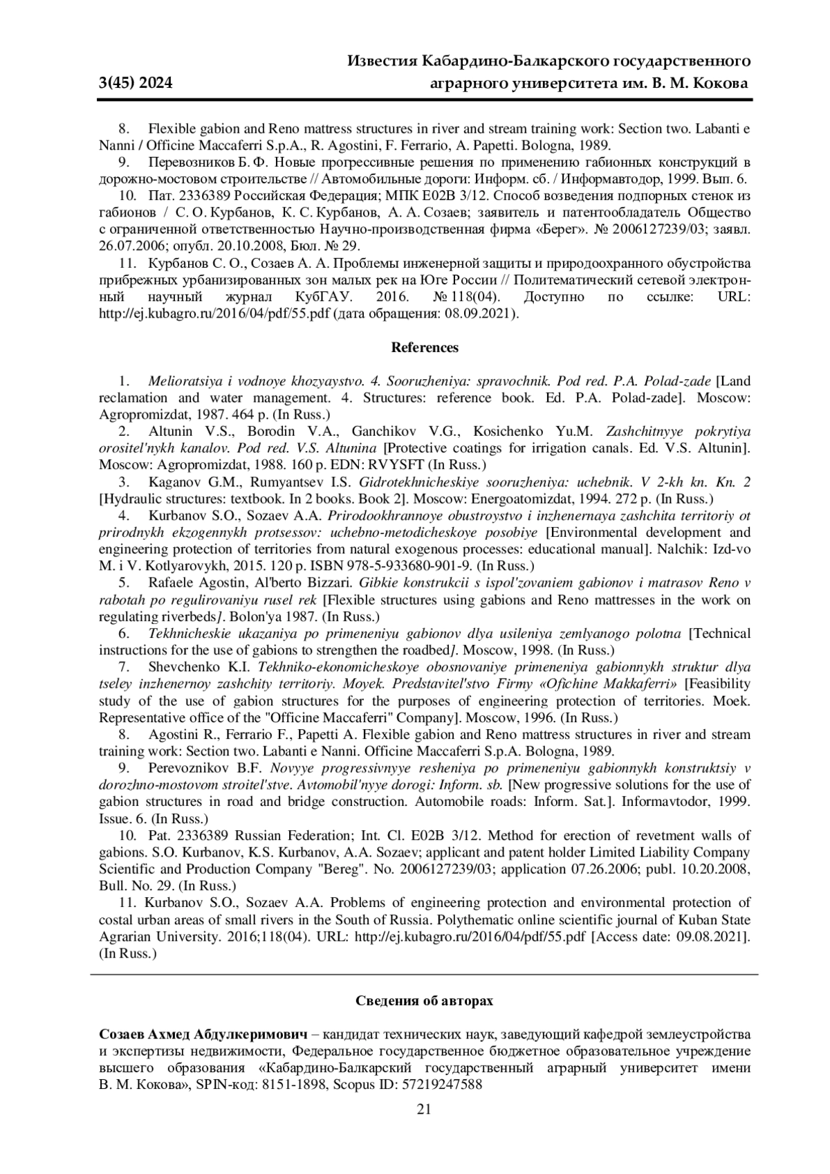 11. Курбанов С. О., Созаев А. А. Проблемы инженерной защиты и природоохранного обустройства прибрежных урбанизированных зон малых рек на Юге России // Политематический сетевой электронный научный журнал КубГАУ. 2016. № 118(04). Доступно по ссылке: URL: http://ej.kubagro.ru/2016/04/pdf/55.pdf (дата обращения: 08.09.2021). EDN: TRTJUE