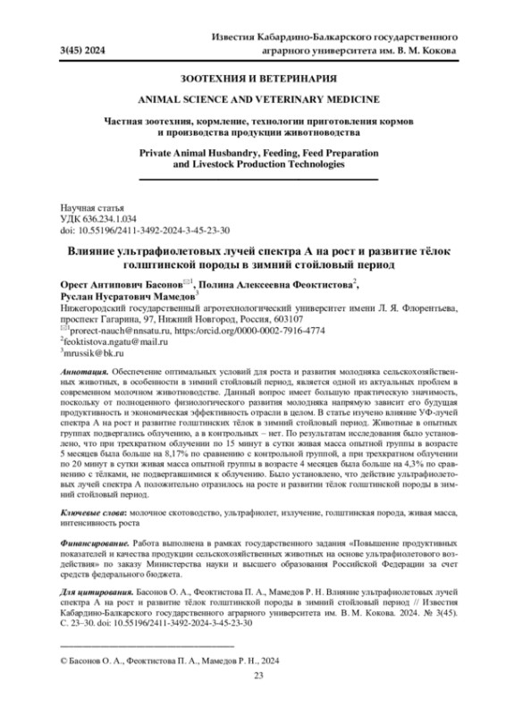 4. 	Басонов О. А., Решетова В. О. Влияние ультрафиолетовых лучей на гематологические показатели козлят породы Мурсиана-Гранадина // Вестник Нижегородского государственного агротехнологического университета. 2023. № 4(40). С. 63-68. EDN: HPUTYW