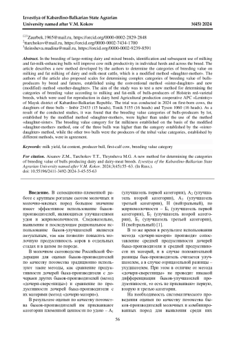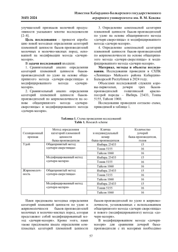 В ходе ведения селекционно-племенной работы с крупным рогатым скотом молочных и комбинированных пород выявление и последующее использование быков-улучшателей удоя и жирномолочности позволит повысить молочную продуктивность коров в отдельных стадах и в целом по породе. В статье излагается разработанная авторами новая методика определения категорий племенной ценности по удою и жирномолочности быков-производителей молочных и молочно-мясных пород, представляющая собой модифицированный метод «дочери-матери». Авторами статьи предложены также шкалы определения комплексных категорий племенной ценности быков-производителей по удою и жирномолочности, устанавливаемые с использованием общепринятого метода «дочери-сверстницы» и нового (модифицированного) метода «дочери-матери». Цель исследования заключалась в апробации новой методики определения категорий племенной ценности по удою и жирномолочности быков-производителей голштинской красно-пестрой породы, которых использовали для воспроизводства в молочном стаде СХПК «Ленинцы» Майского района Кабардино-Балкарской Республики. Апробация проводилась в 2024 году на коровах-первотелках, являющихся дочерьми трех быков-производителей - Имбирь 23433 (15 голов), Тоник 5155 (16 голов) и Тайсон 1060 (16 голов). В результате проведенных исследований выяснили, что категории племенной ценности быков-производителей по удою, установленные модифицированным методом «дочери-матери», оказались выше, чем при использовании метода «дочери-сверстницы». Категория племенной ценности по жирномолочности, установленная на основе модифицированного метода «дочери-матери», у одного из трех быков-производителей была выше категории, установленной методом «дочери-сверстницы», в то время как у двух других быков-производителей категории племенной ценности, установленные разными методами, совпадали.