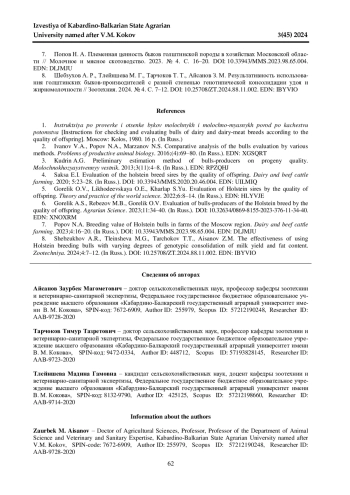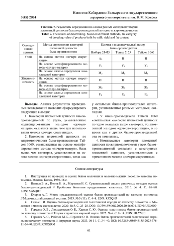 7. Попов Н. А. Племенная ценность быков голштинской породы в хозяйствах Московской области // Молочное и мясное скотоводство. 2023. № 4. С. 16-20. DOI: 10.33943/MMS.2023.98.65.004 EDN: DLJMJU