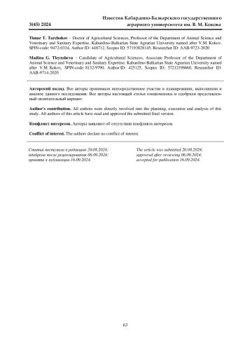 8. Шебзухов А. Р., Тлейншева М. Г., Тарчоков Т. Т., Айсанов З. М. Результативность использования голштинских быков-производителей с разной степенью генотипической консолидации удоя и жирномолочности // Зоотехния. 2024. № 4. С. 7-12. DOI: 10.25708/ZT.2024.88.11.002 EDN: IBYVIO