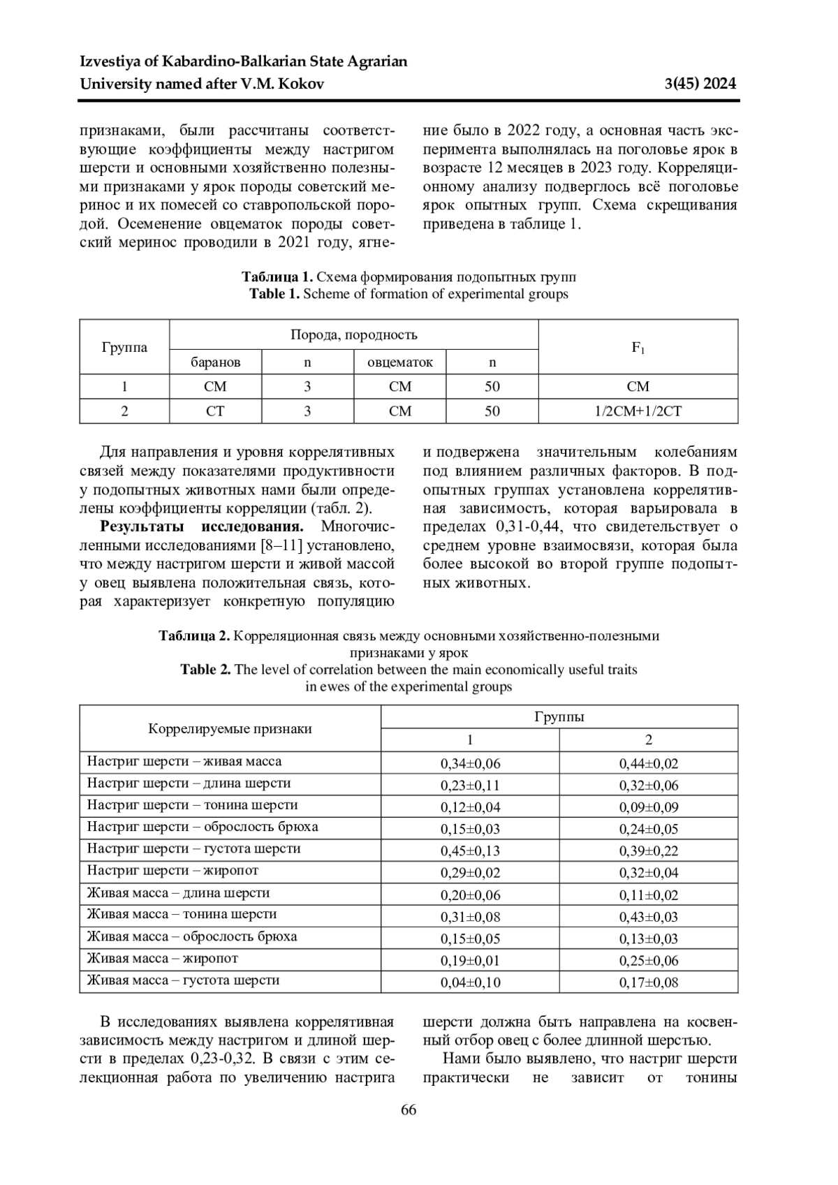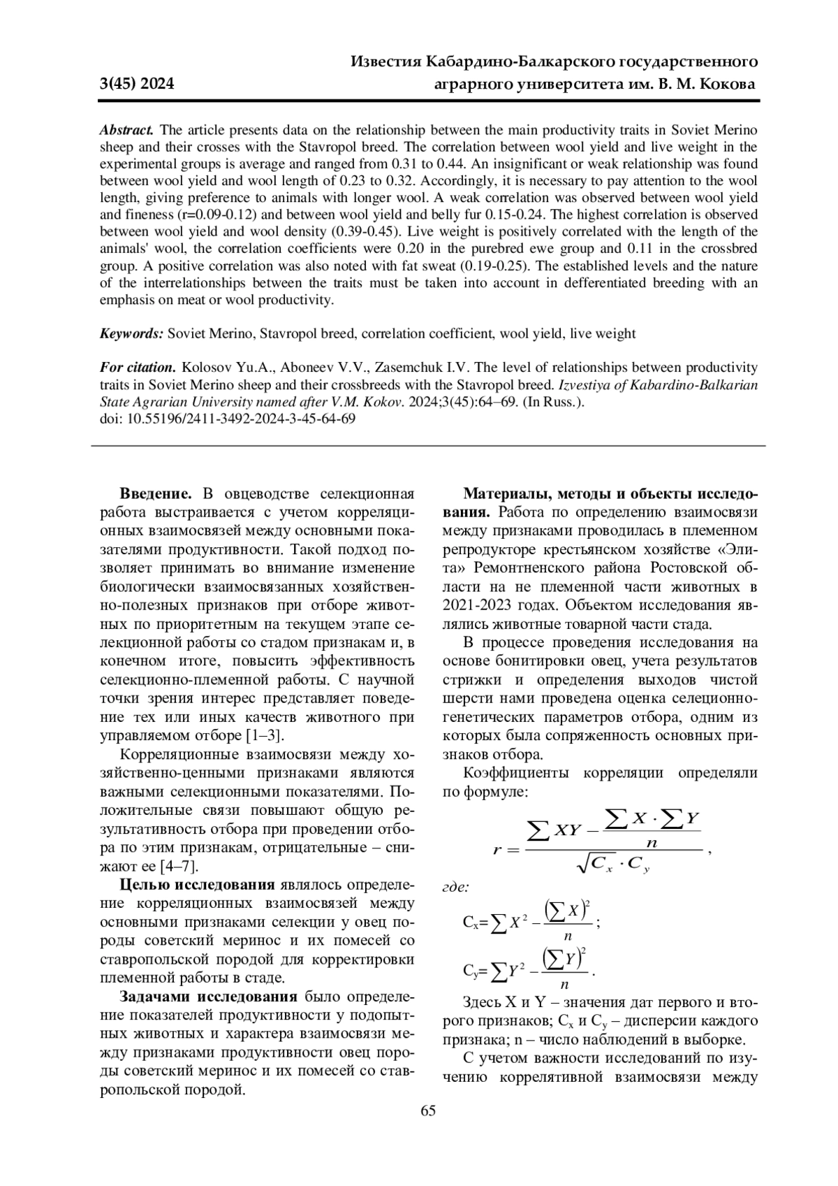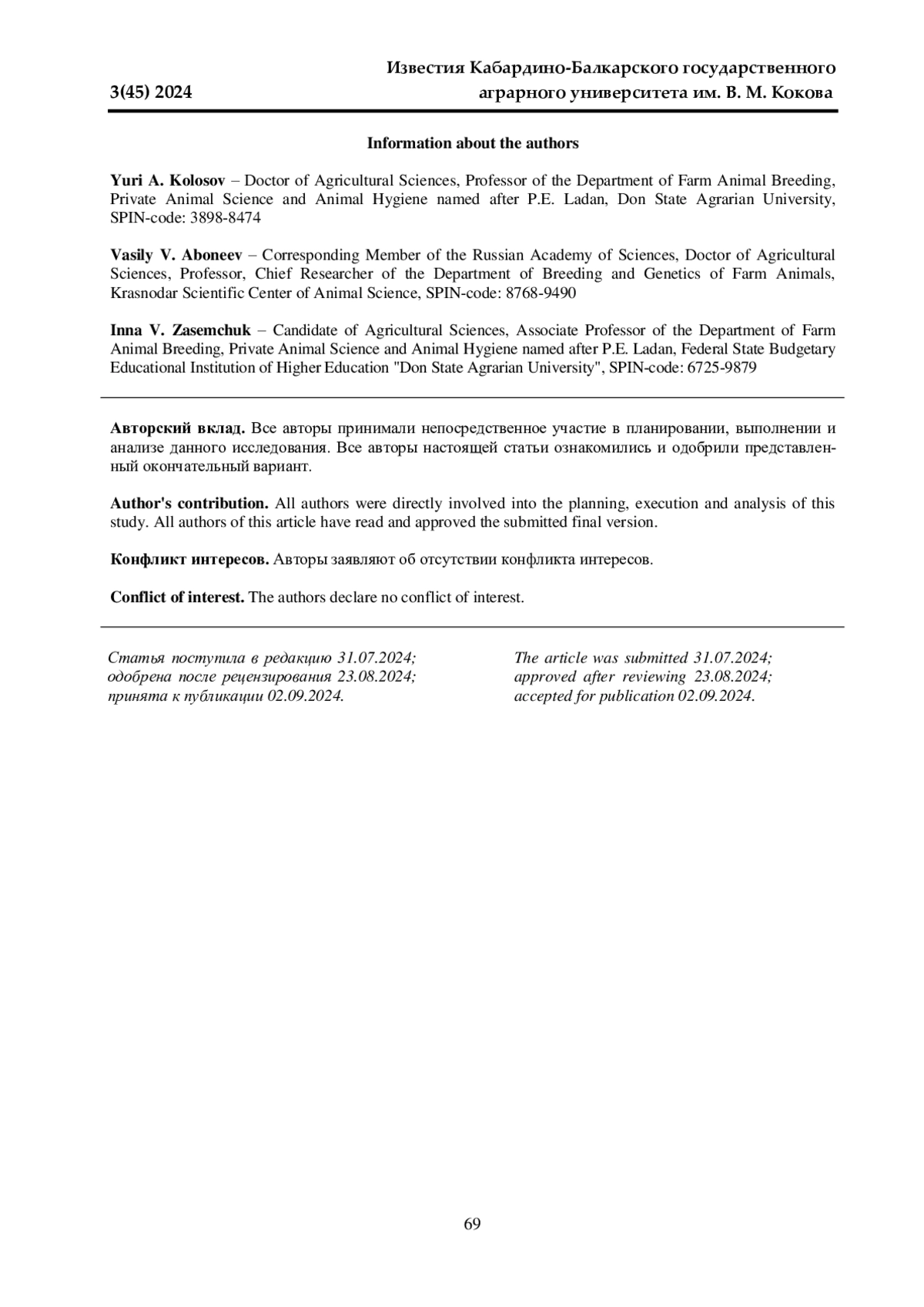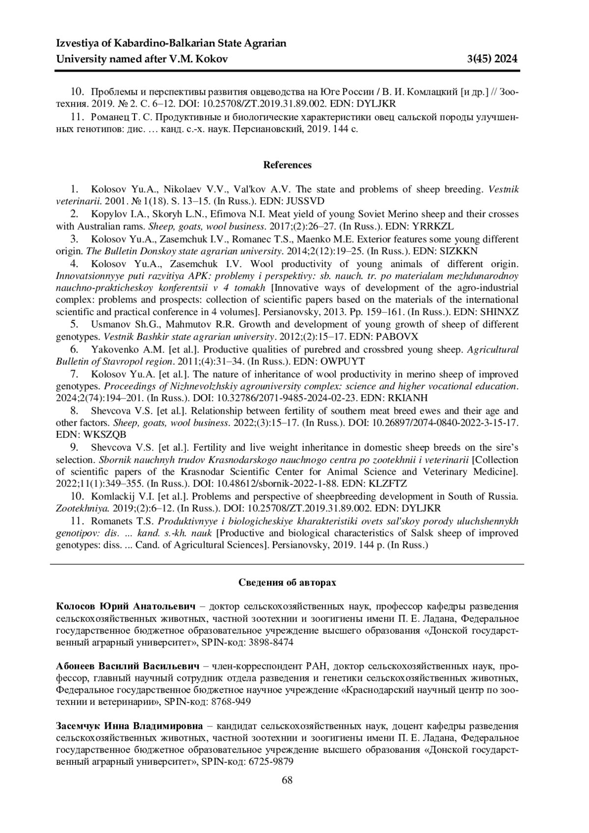 7. 	Характер наследования шерстной продуктивности у мериносовых овец улучшенных генотипов / Ю. А. Колосов [и др.] // Известия Нижневолжского агроуниверситетского комплекса: Наука и высшее профессиональное образование. 2024. № 2(74). С. 194-201. DOI: 10.32786/2071-9485-2024-02-23 EDN: RKIANH