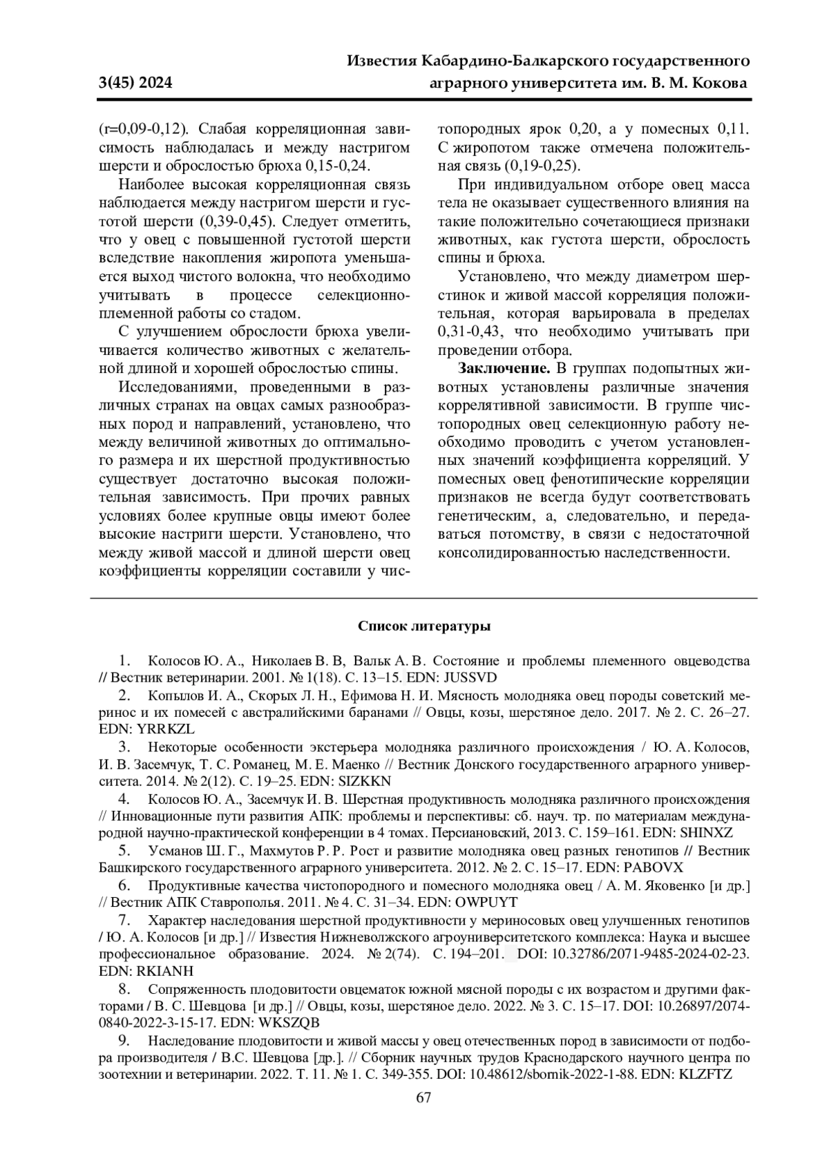 8. 	Сопряженность плодовитости овцематок южной мясной породы с их возрастом и другими факторами / В. С. Шевцова [и др.] // Овцы, козы, шерстяное дело. 2022. № 3. С. 15-17. 10.26897/2074- 0840-2022-3-15-17. DOI: 10.26897/2074-0840-2022-3-15-17 EDN: WKSZQB