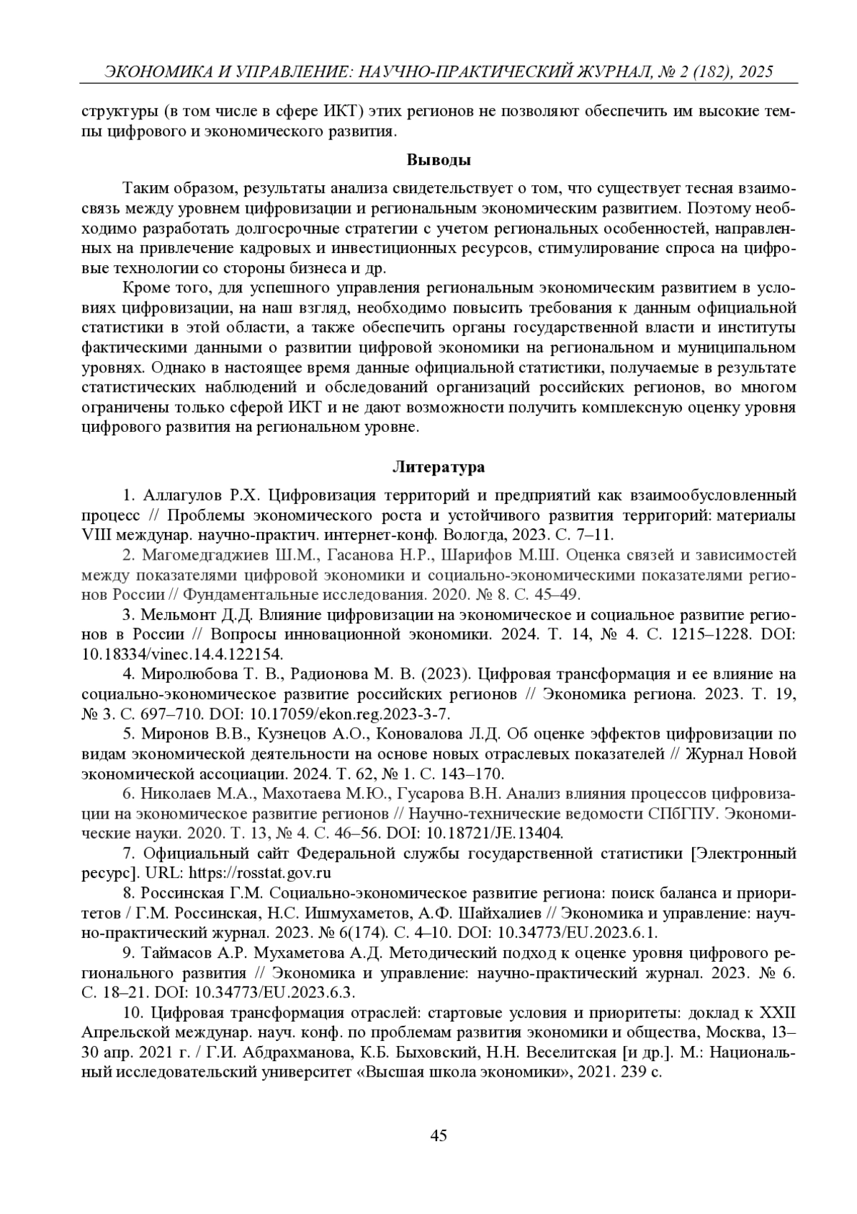 МУХАМЕТОВА А. Д. ВЛИЯНИЕ ЦИФРОВИЗАЦИИ НА РЕГИОНАЛЬНОЕ ЭКОНОМИЧЕСКОЕ РАЗВИТИЕ // ЭКОНОМИКА И УПРАВЛЕНИЕ: НАУЧНО-ПРАКТИЧЕСКИЙ ЖУРНАЛ. 2025. № 2 (182)