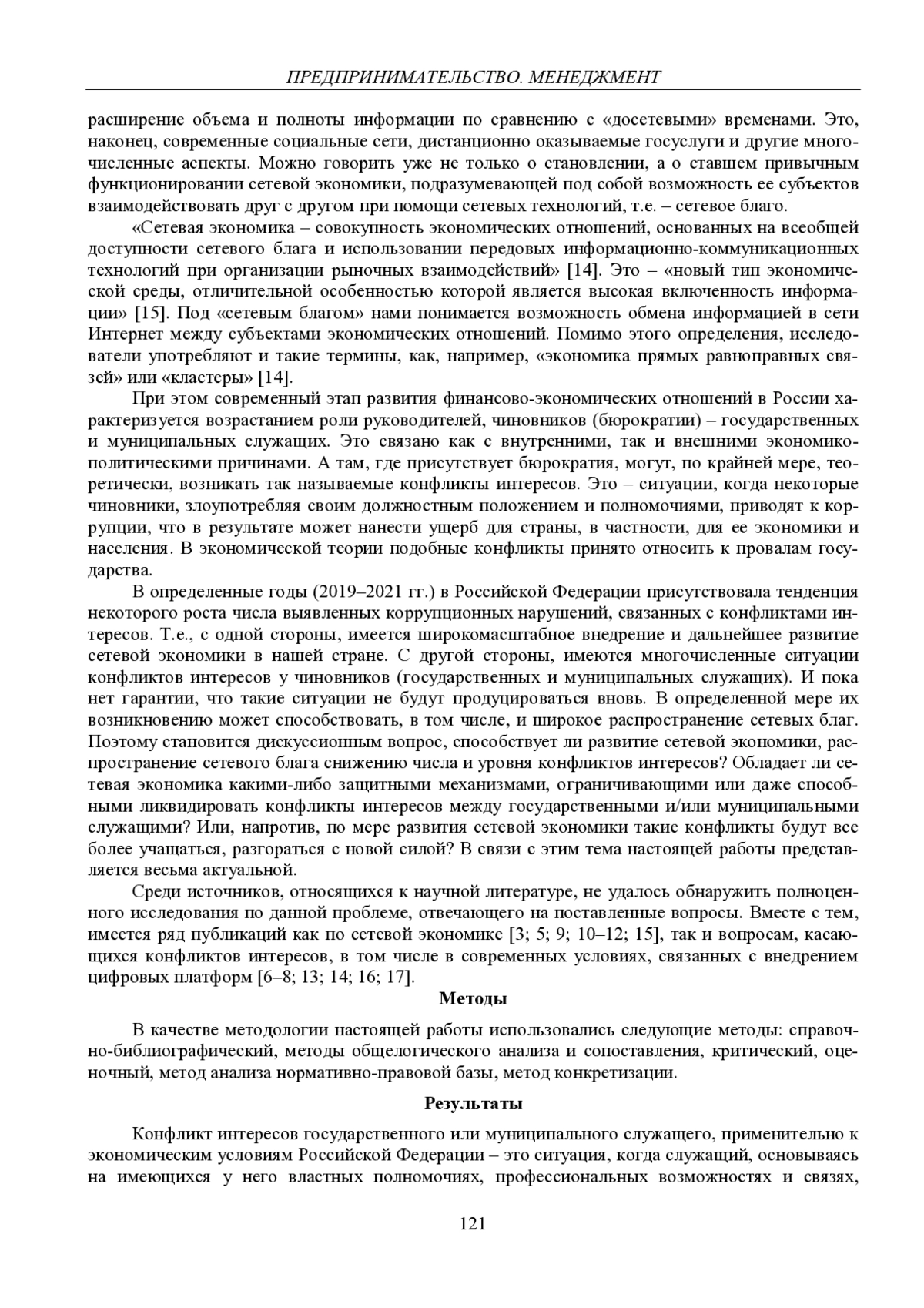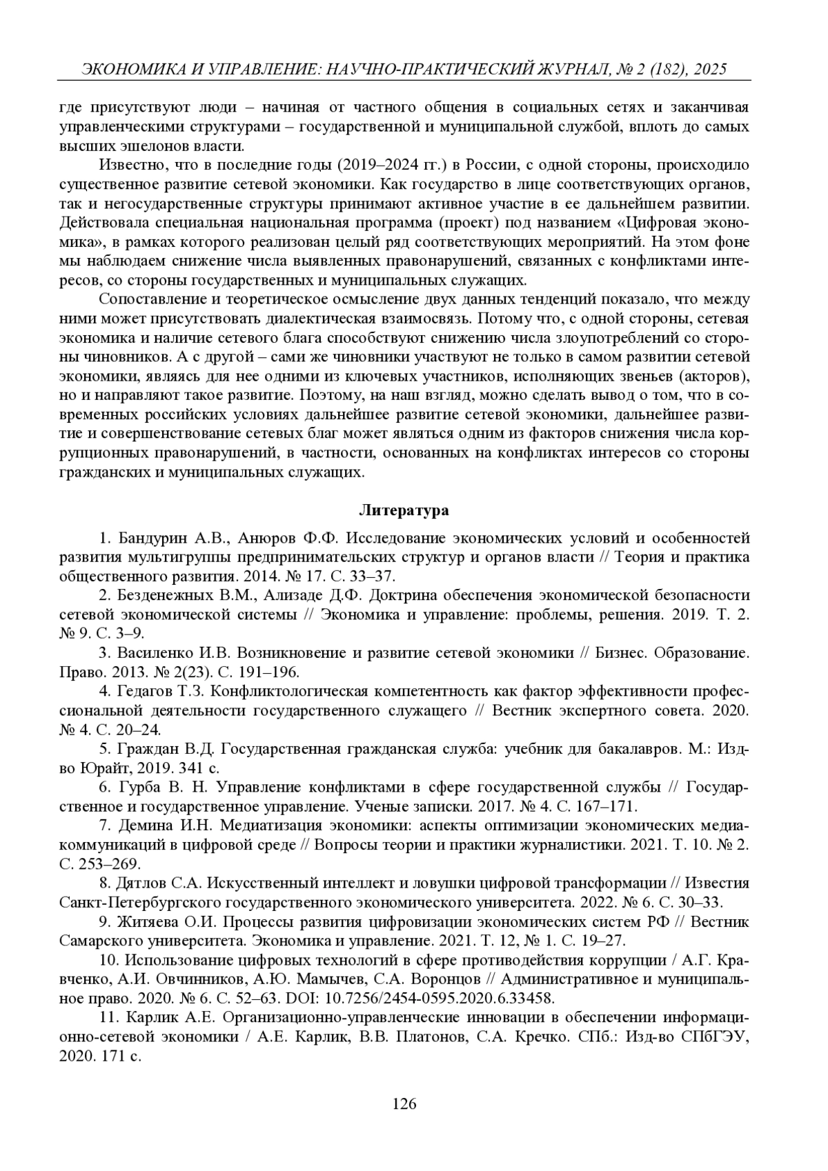 Статья: КОНФЛИКТЫ ИНТЕРЕСОВ ГОСУДАРСТВЕННЫХ И/ИЛИ МУНИЦИПАЛЬНЫХ СЛУЖАЩИХ В УСЛОВИЯХ СЕТЕВОЙ ЭКОНОМИКИ (2025)