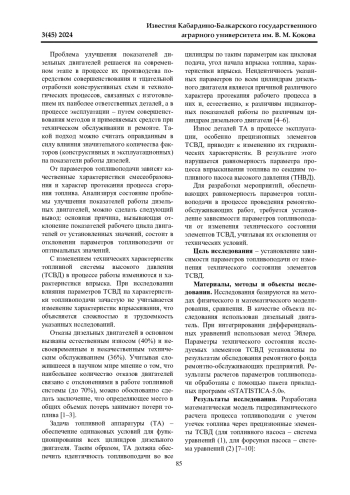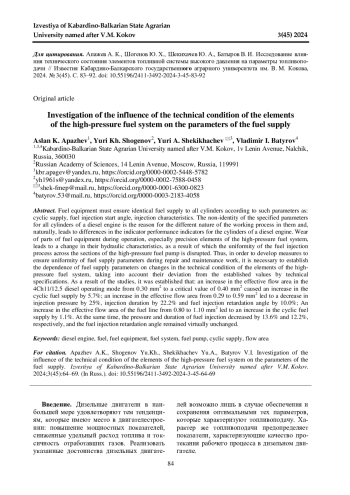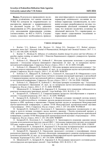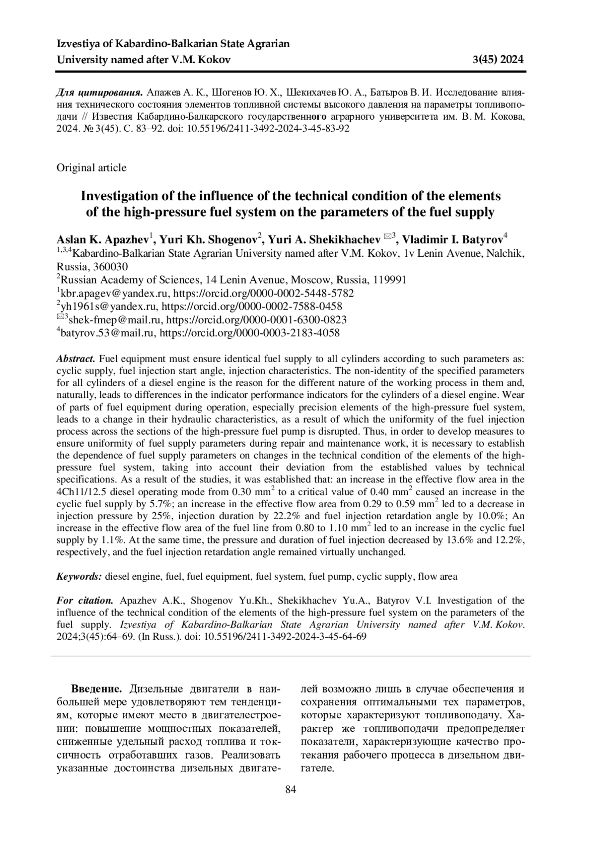 АПАЖЕВ А. К., ШОГЕНОВ Ю. Х., ШЕКИХАЧЕВ Ю. А., БАТЫРОВ В. И. ИССЛЕДОВАНИЕ ВЛИЯНИЯ ТЕХНИЧЕСКОГО СОСТОЯНИЯ ЭЛЕМЕНТОВ ТОПЛИВНОЙ СИСТЕМЫ ВЫСОКОГО ДАВЛЕНИЯ НА ПАРАМЕТРЫ ТОПЛИВОПОДАЧИ // ИЗВЕСТИЯ КАБАРДИНО-БАЛКАРСКОГО ГОСУДАРСТВЕННОГО АГРАРНОГО УНИВЕРСИТЕТА ИМ. В. М. КОКОВА. 2024. № 3 (45)