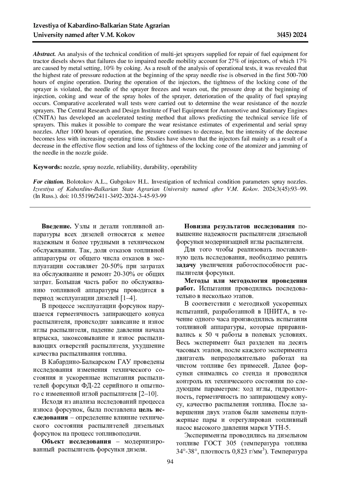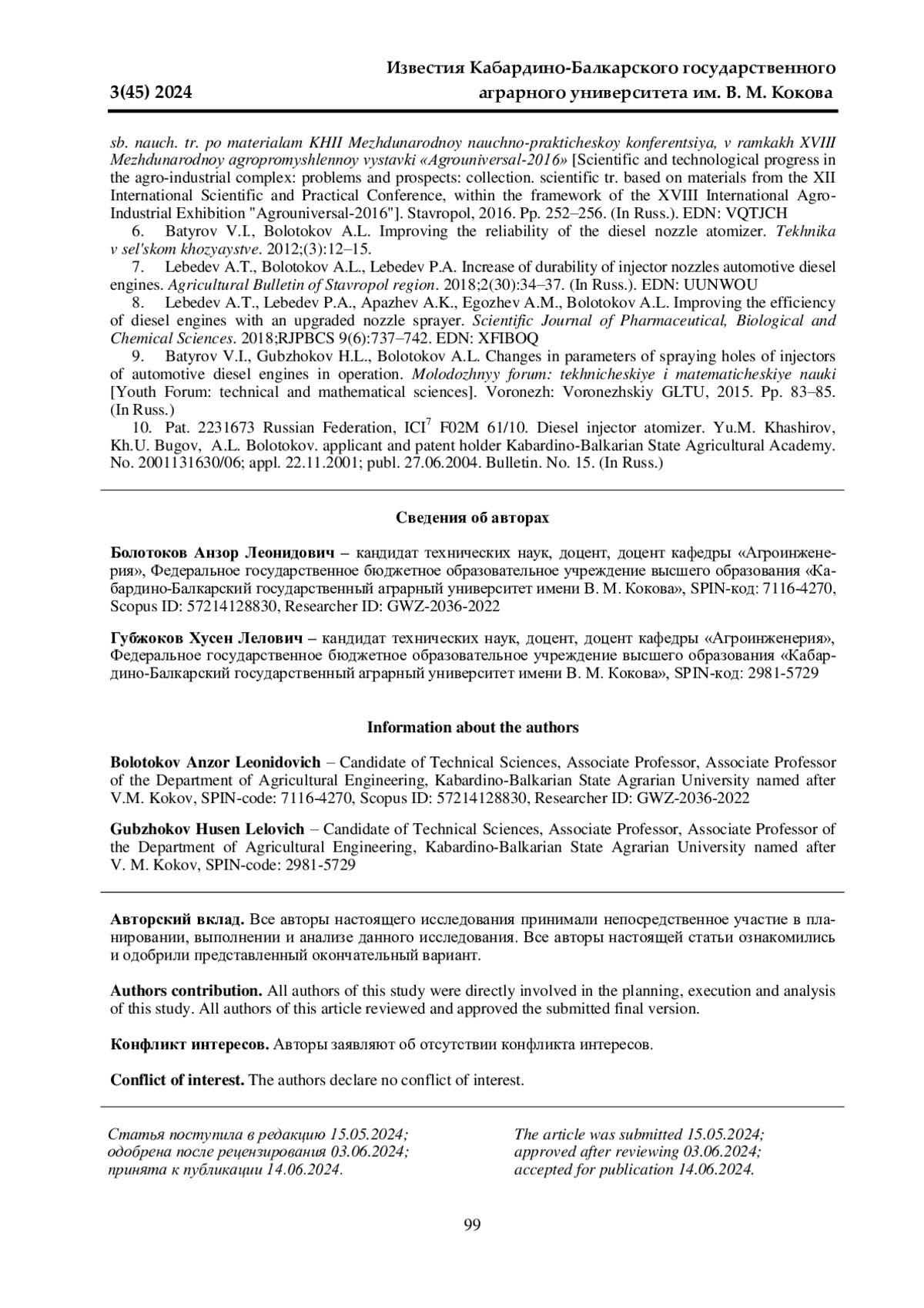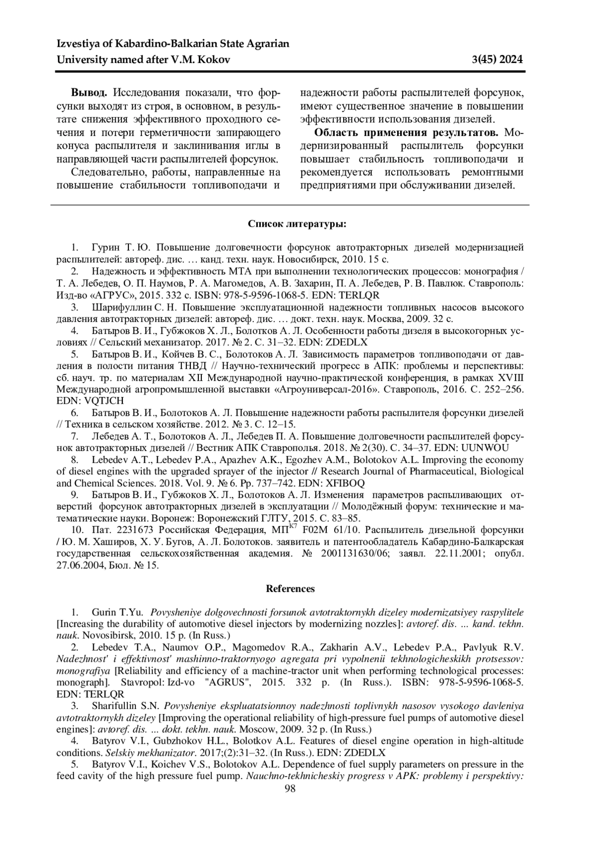 6. Батыров В. И., Болотоков А. Л. Повышение надежности работы распылителя форсунки дизелей // Техника в сельском хозяйстве. 2012. № 3. С. 12-15.