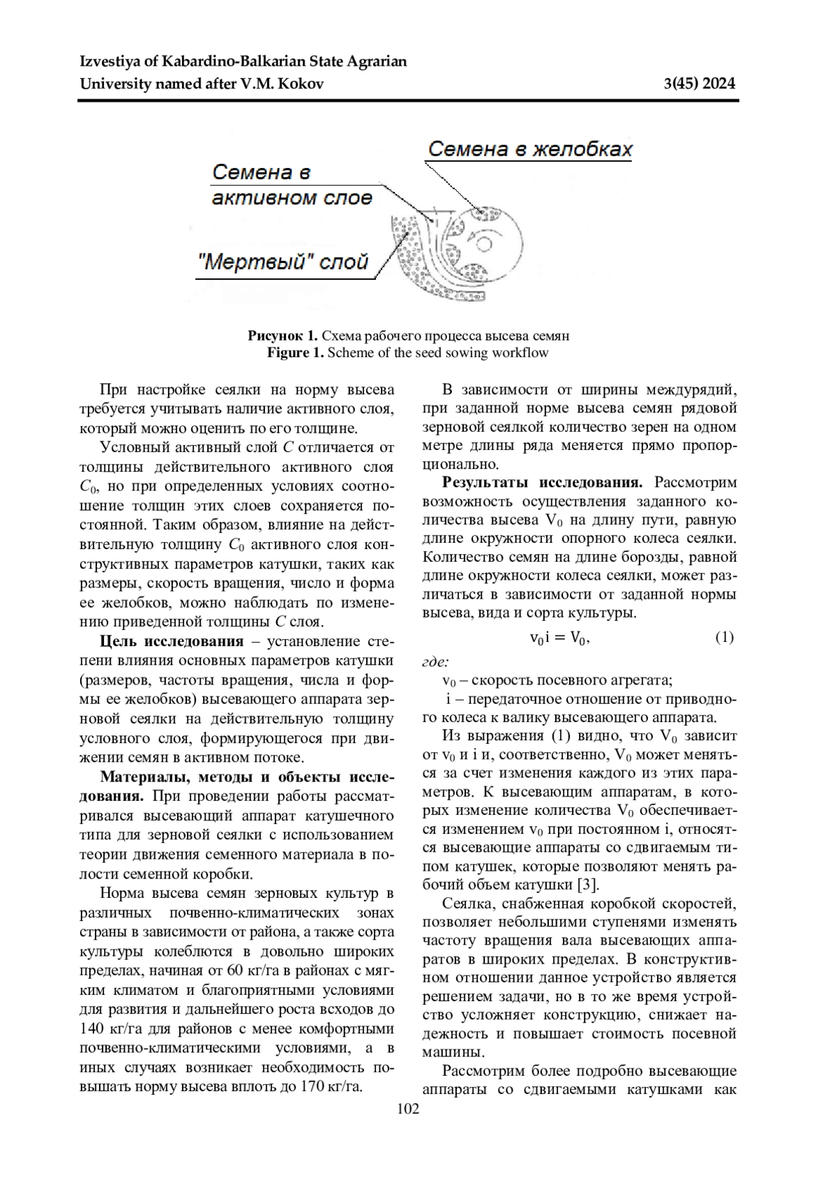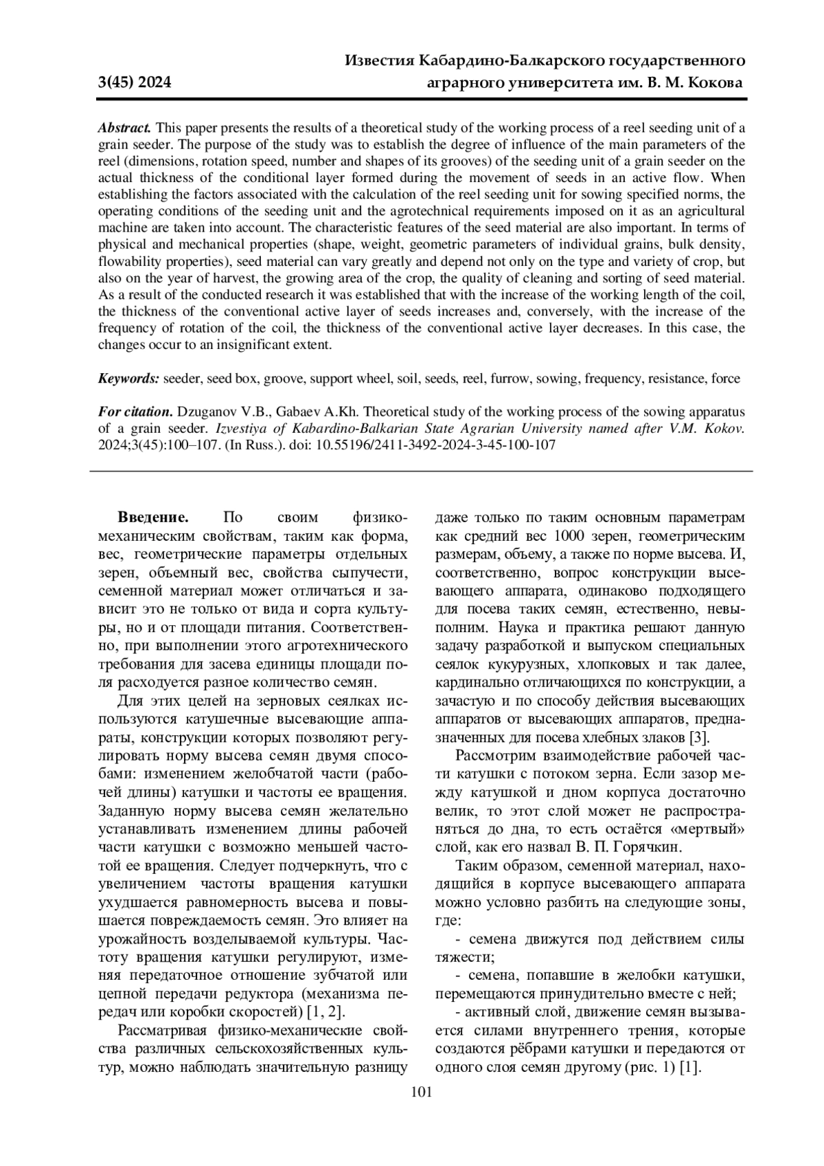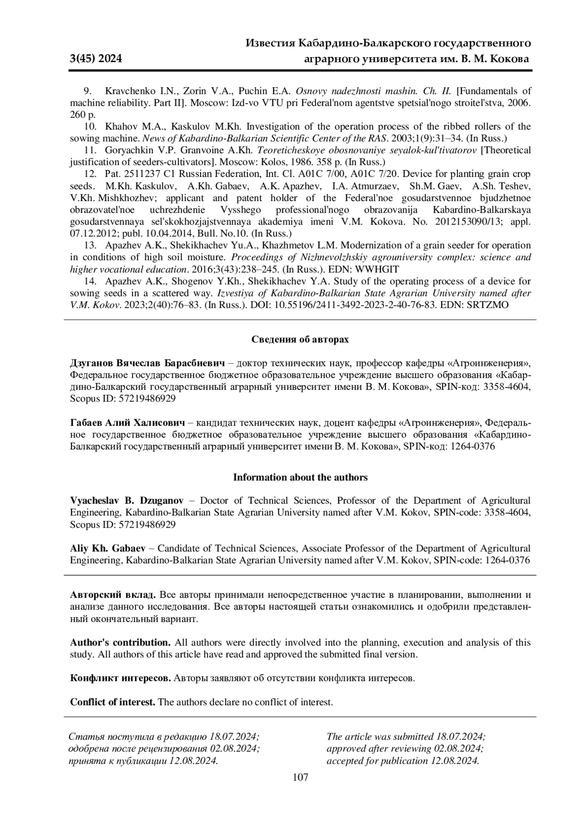 8. Каскулов М. Х., Габаев А. Х. Теоретическое исследование процесса высева и заделки семян в почву посевной секцией сеялки с магнитным высевающим аппаратом // Известия Кабардино-Балкарского государственного аграрного университета им. В. М. Кокова. 2013. № 2(2). С. 77-82. EDN: SHVJLL