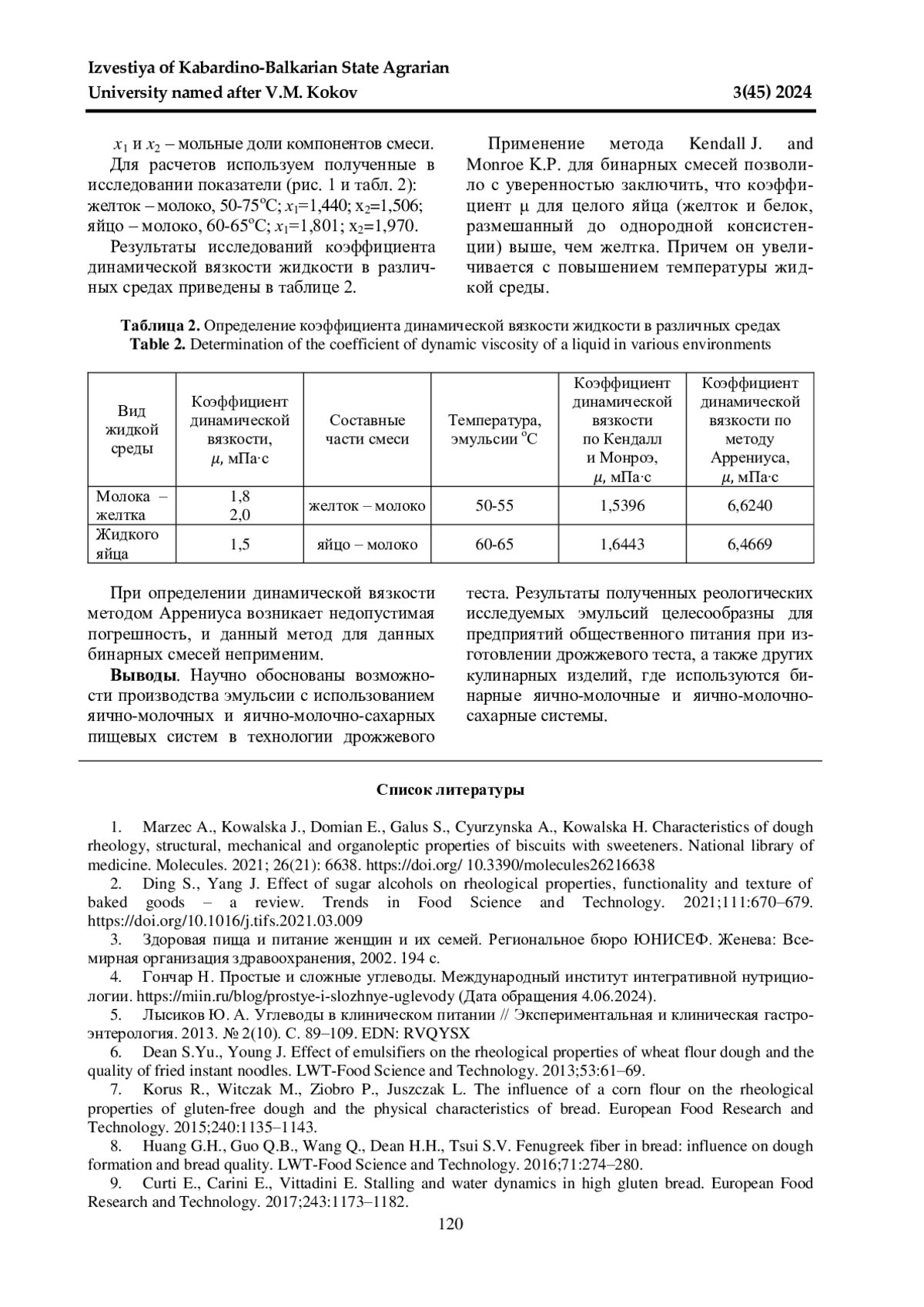 В статье рассмотрена проблема повышения качества дрожжевого теста, приготовленного безопасным способом, путем введения эмульсионных продуктов, предварительно подготовленных нужной консистенции и составных компонентов. Объектами исследования были яично-молочные, яично-молочно-сахарные смеси различной концентрации. В процессе выполнения работы использовались органолептические, реологические, физико-химические и статистические методы. Проведены исследования по выявлению влияния концентрации белка, отдельных составных компонентов яйца и, в частности, желтка в бинарной системе с молоком на плотность пищевой системы. Исследуемые яичномолочные массы были использованы для обоснования процесса их эмульгирования и взаимодействия со структурой дрожжевого теста. Бинарная композиция желтка или целого яйца (белок и желток) с молоком или молоком и сахаром подвергалась интенсивному перемешиванию, в результате чего получена эмульсия различной вязкости. Выявлены оптимальные концентрации составных компонентов эмульсии - яично-молочная смесь без сахара 12:70; желток, молоко и сахар 8:74:15; яично-молочная смесь с сахаром 7:38:15. Установлена динамика изменения вязкости эмульсии. При изменении температуры на 1оС вязкость изменяется на 0,02, а при изменении на 25оС, т. е. до критической температуры раствора (75оС) его вязкость изменится на 0,72, а не 0,50; т. е. для бинарных смесей (желток - молоко) наблюдается зависимость от свойств составных компонентов эмульсии. С изменением состава эмульсии (целое яйцо или отдельно его желток) увеличение вязкости осуществляется уже при более низкой температуре - от 50 до 62оС, что в результате приведет к денатурации белка, которая происходит в интервале температур между 58 и 80оС, а желтка - в гораздо более узком диапазоне - 63-70оС. Поэтому при температуре 75оС наблюдается денатурация смеси желтка и белка, т. е. критическая температура для вязкости смеси.