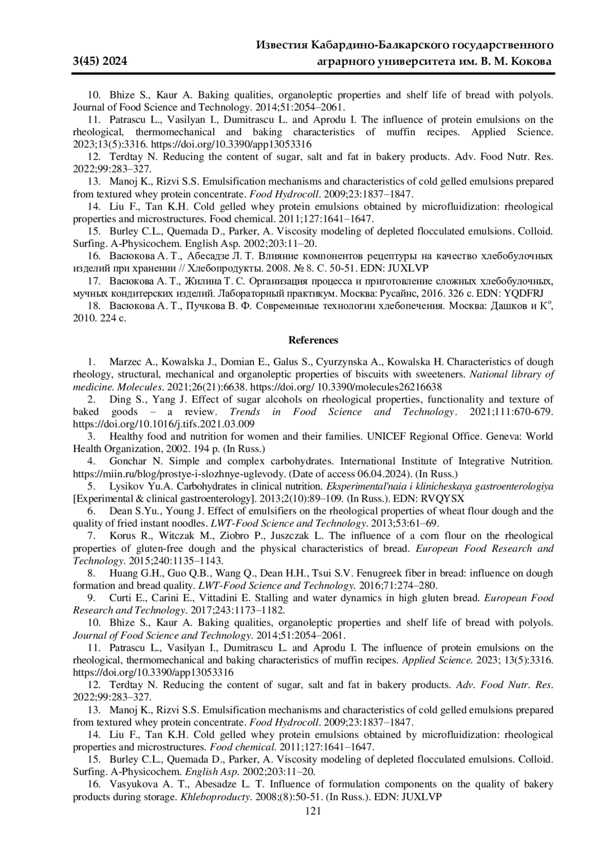 16. Васюкова А. Т., Абесадзе Л. Т. Влияние компонентов рецептуры на качество хлебобулочных изделий при хранении // Хлебопродукты. 2008. № 8. С. 50-51. EDN: JUXLVP