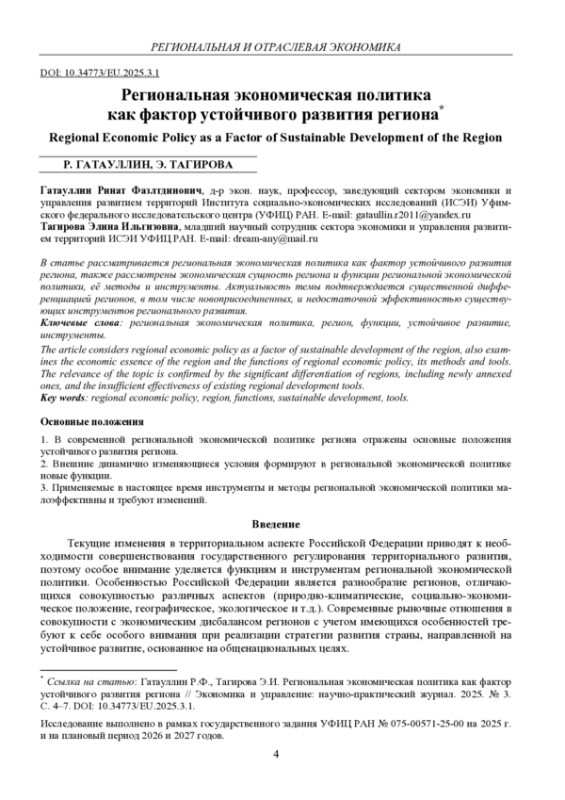 Текущие изменения в территориальном аспекте Российской Федерации приводят к необходимости совершенствования государственного регулирования территориального развития, поэтому особое внимание уделяется функциям и инструментам региональной экономической политики. Особенностью Российской Федерации является разнообразие регионов, отличающихся совокупностью различных аспектов (природно-климатические, социально-экономическое положение, географическое, экологическое и т. д.). Современные рыночные отношения в совокупности с экономическим дисбалансом регионов с учетом имеющихся особенностей требуют к себе особого внимания при реализации стратегии развития страны, направленной на устойчивое развитие, основанное на общенациональных целях