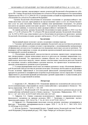 1. 	Андрюхин А.Ю., Михайлов В.В. Повышение финансово-экономической самодостаточности муниципальных образований на основе взаимодействия с гражданами и бизнесом // Вопросы управления. 2015. № 2(33). С. 102-109.