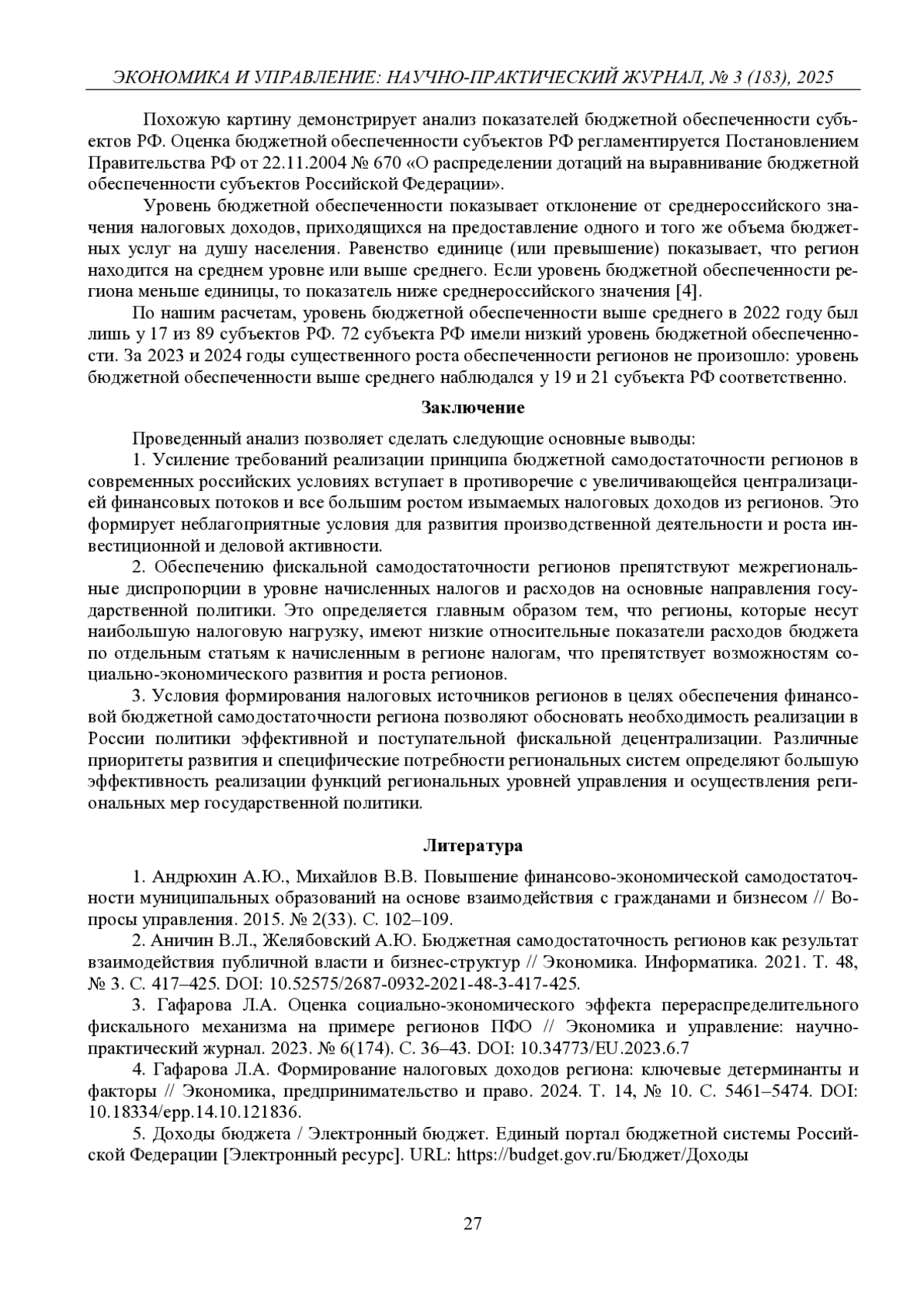 3. 	Гафарова Л.А. Оценка социально-экономического эффекта перераспределительного фискального механизма на примере регионов ПФО // Экономика и управление: научно-практический журнал. 2023. № 6(174). С. 36-43.  DOI: 10.34773/EU.2023.6.7  EDN: WEHVQE