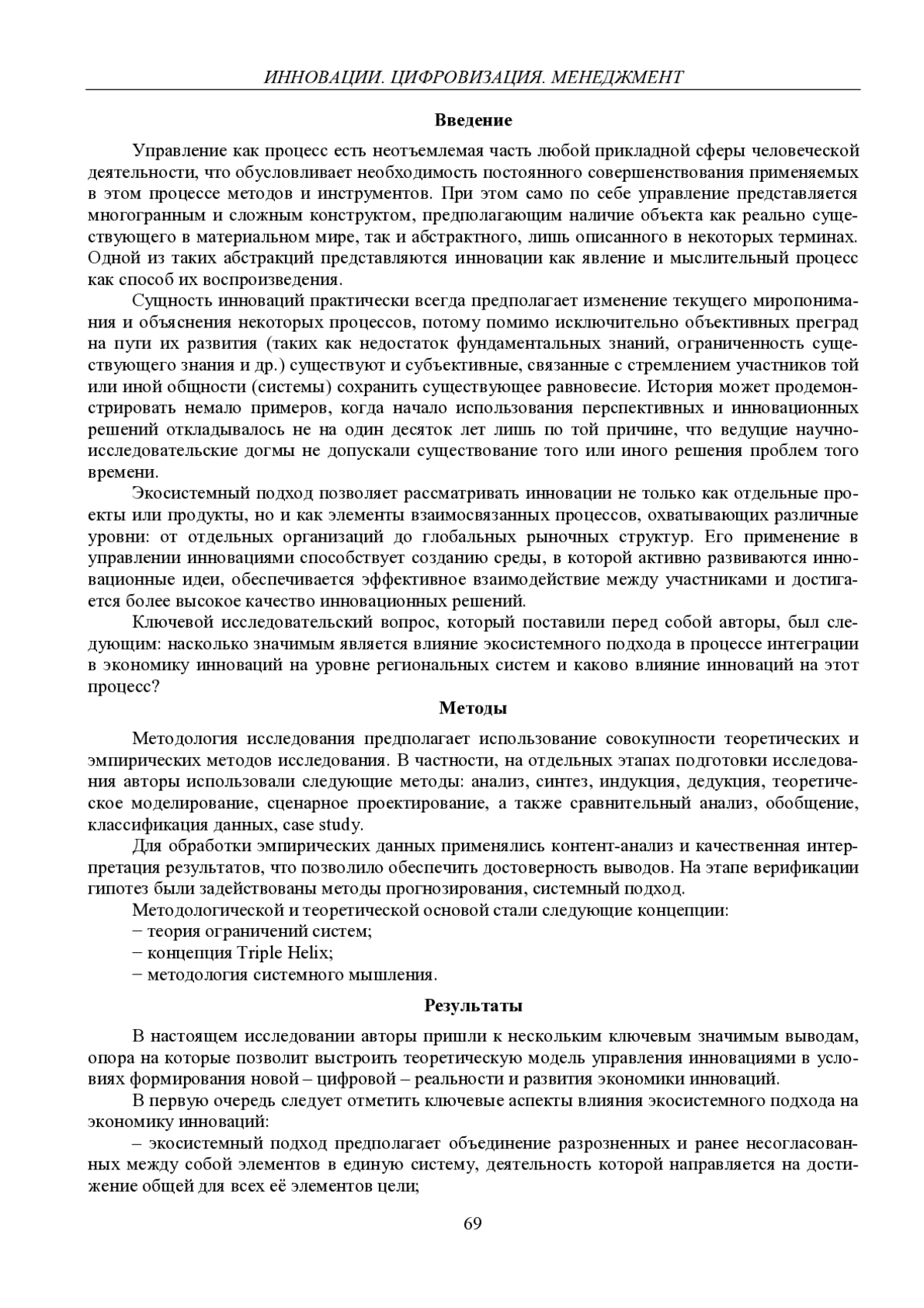 В настоящей работе авторы рассматривают экосистемный подход как основу развития экономики инноваций. Авторы анализируют влияние технологий на трансформацию экосистемного подхода и строят свои рассуждения, исходя из теории ограничений Элияху Голдратта. Кроме того, авторы уделяют внимание роли инноваций в интеграции экосистемного подхода и раскрывают существующие проблемы в системах управления инновациями, формируя тем самым будущую рамку исследований для теоретического моделирования обновлённой модели управления инновациями. В рамках исследования также был уточнён теоретический аппарат в части подходов к определению инноваций