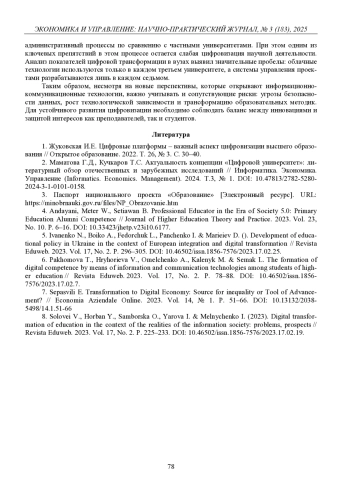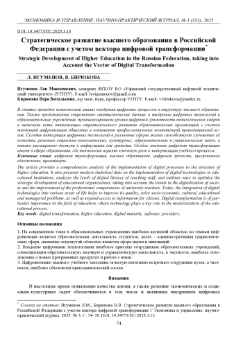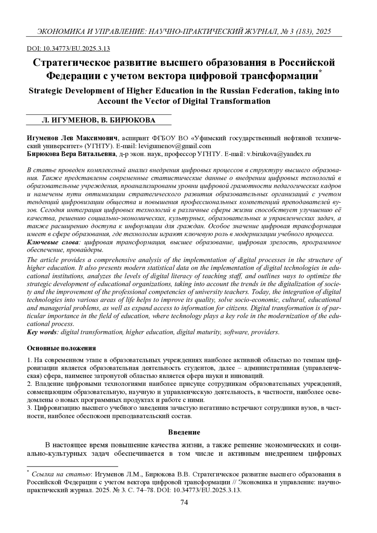 ИГУМЕНОВ Л. М., БИРЮКОВА В. В. СТРАТЕГИЧЕСКОЕ РАЗВИТИЕ ВЫСШЕГО ОБРАЗОВАНИЯ В РОССИЙСКОЙ ФЕДЕРАЦИИ С УЧЕТОМ ВЕКТОРА ЦИФРОВОЙ ТРАНСФОРМАЦИИ // ЭКОНОМИКА И УПРАВЛЕНИЕ: НАУЧНО-ПРАКТИЧЕСКИЙ ЖУРНАЛ. 2025. № 3 (183)