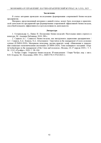 2. 	Суярков А.С. Сущность бизнес-модели, как инструмента управления предприятием / А.С. Суярков, Б.Д. Лошков, Х.А. Абдухманов // Innovation in the management of socio-economic systems (ICIMSS-2020): Материалы междунар. научно-практич. конф. “Инновации в управлении социально-экономическими системами” (ICIMSS-2020). Тема пленарного заседания: “Digital technologies in the management of the Crisis and recession”, Москва, 24-27 апреля 2020 г. Т. 3. М.: ООО “Русайнс”, 2020. С. 98-104. EDN: YIMAVR