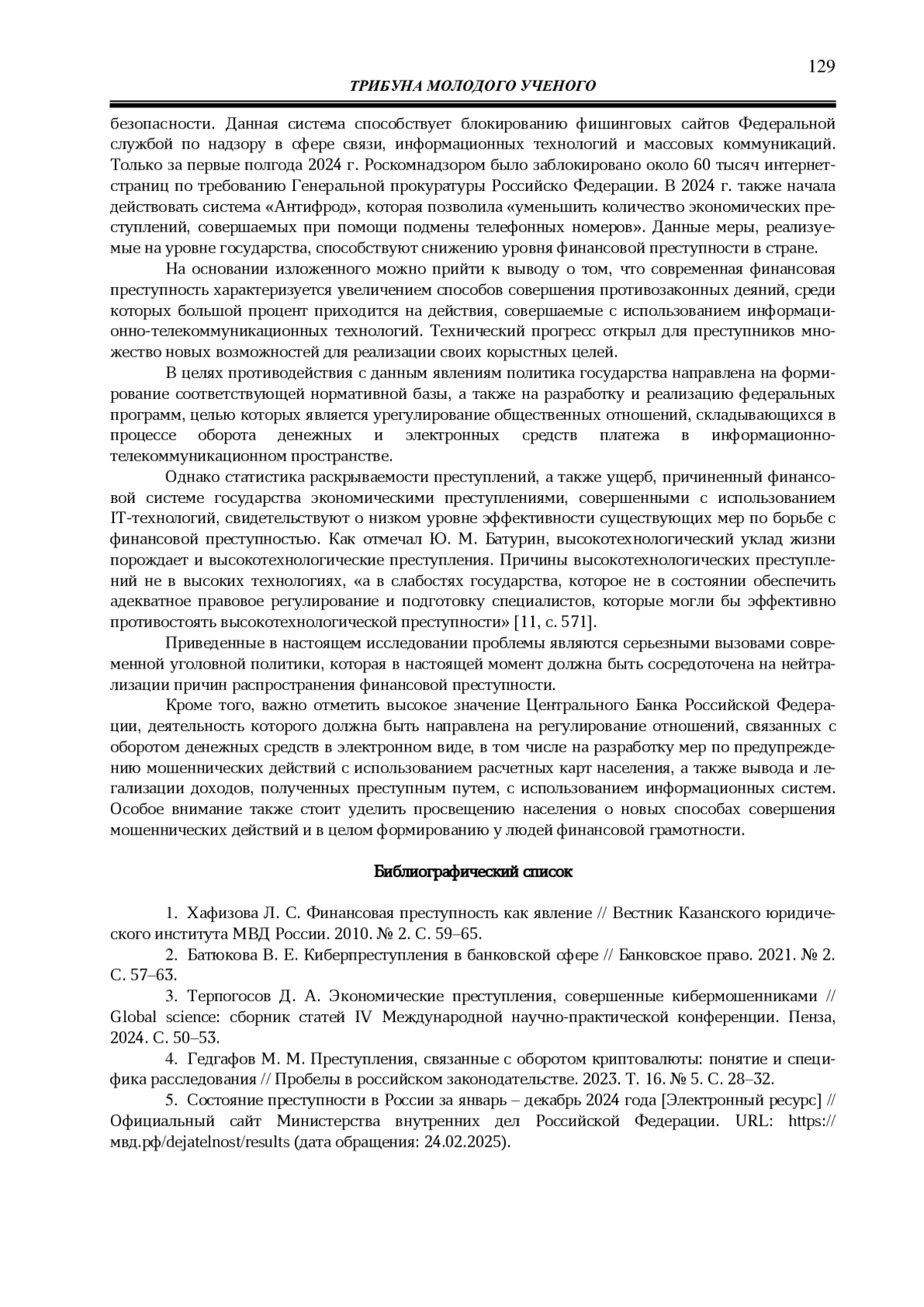 1. 	Хафизова Л. С. Финансовая преступность как явление // Вестник Казанского юридического института МВД России. 2010. № 2. С. 59-65. EDN: PAECZN