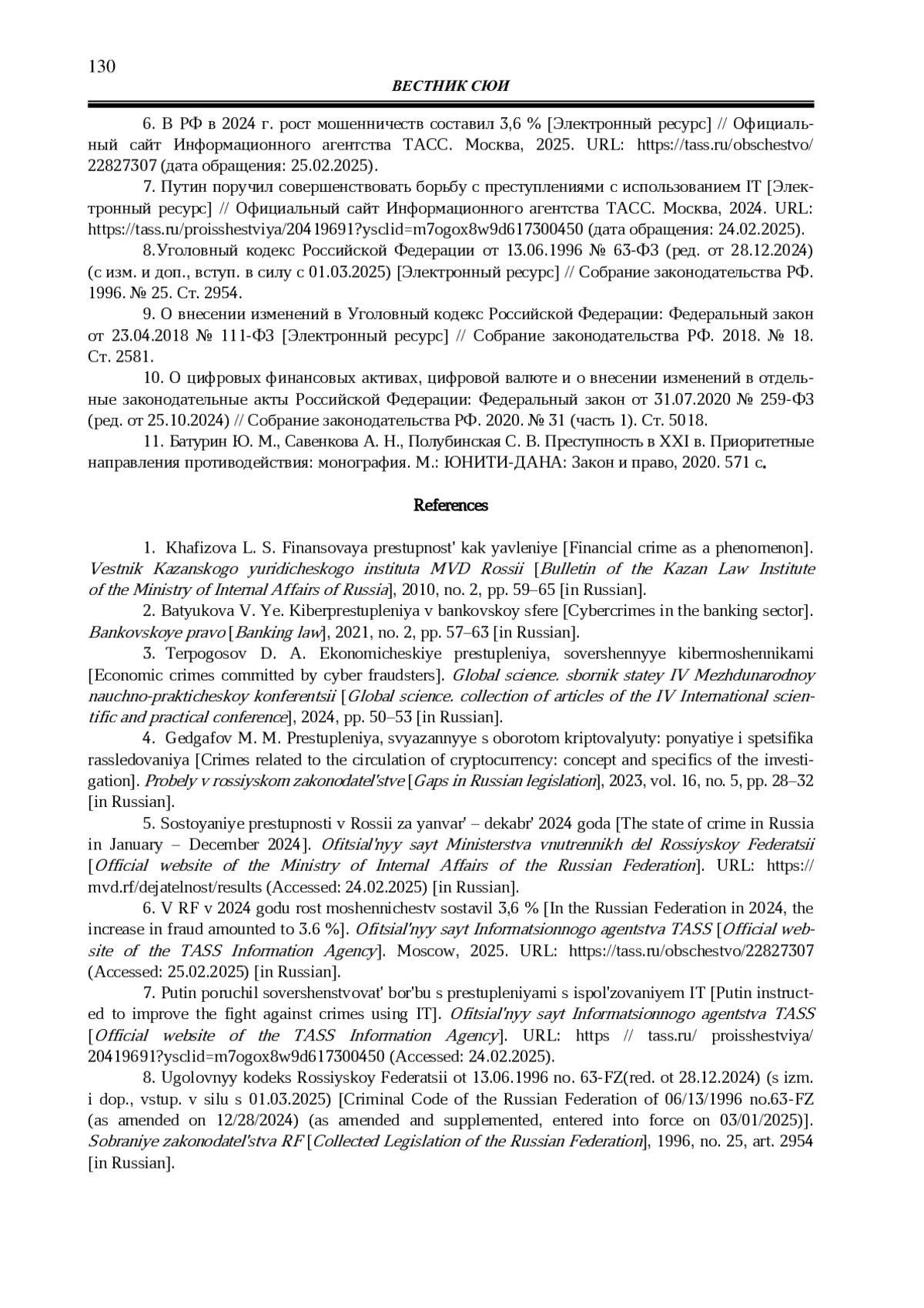 8. 	Уголовный кодекс Российской Федерации от 13.06.1996 № 63-ФЗ (ред. от 28.12.2024) (с изм. и доп., вступ. в силу с 01.03.2025) [Электронный ресурс] // Собрание законодательства РФ. 1996. № 25. Ст. 2954.