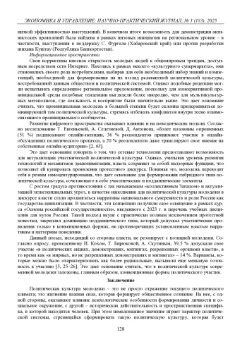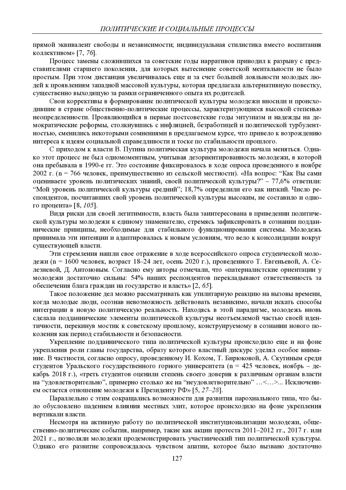 5. Кох И.А. Политическая культура студенческой молодежи / И.А. Кох, Т.С. Бирюкова, А.С. Скутин // Вестник Тюменского государственного университета. Социально-экономические и правовые исследования. 2020. Т. 6, № 2. С. 18-36. DOI: 10.21684/2411-7897-2020-6-2-18-36 EDN: UEDXLU