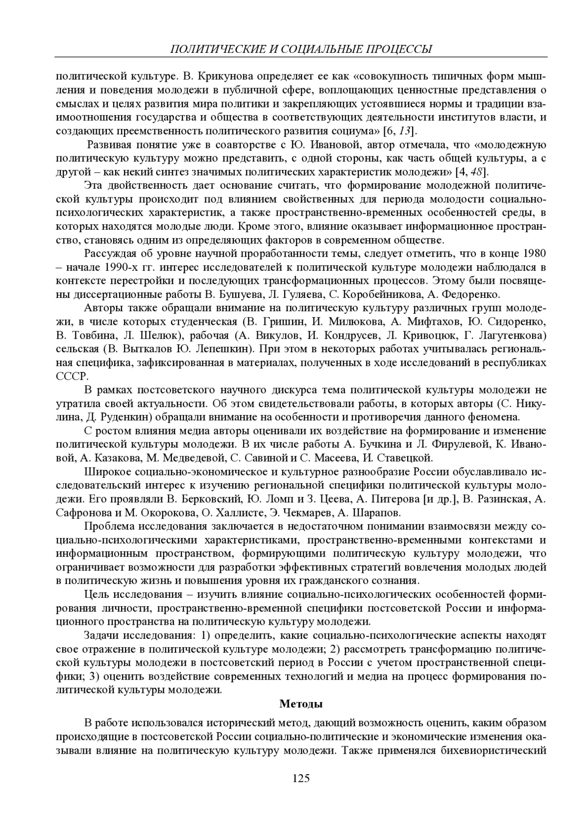 6. Крикунова В.А. Формирование молодежной политической культуры в современной России: автореф. дис. … канд. полит. наук: 23.00.02. Чита, 2009. 23 с. EDN: NLHAET