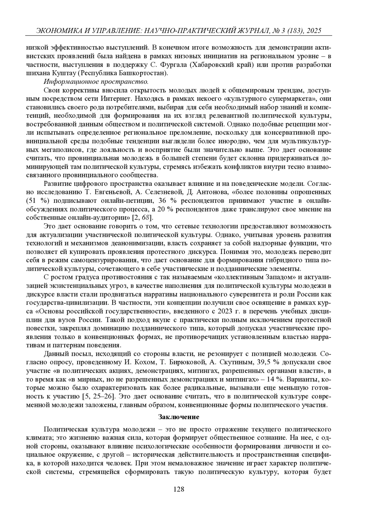 2. Евгеньева Т.В. Политическая культура российской студенческой молодежи: ценностные, образно-символические и поведенческие аспекты / Т.В. Евгеньева, А.В. Селезнёва, Д.Е. Антонов // Гуманитарные науки. Вестник Финансового университета. 2021. Т. 11, № 2. С. 63-71. EDN: ORHIAC
