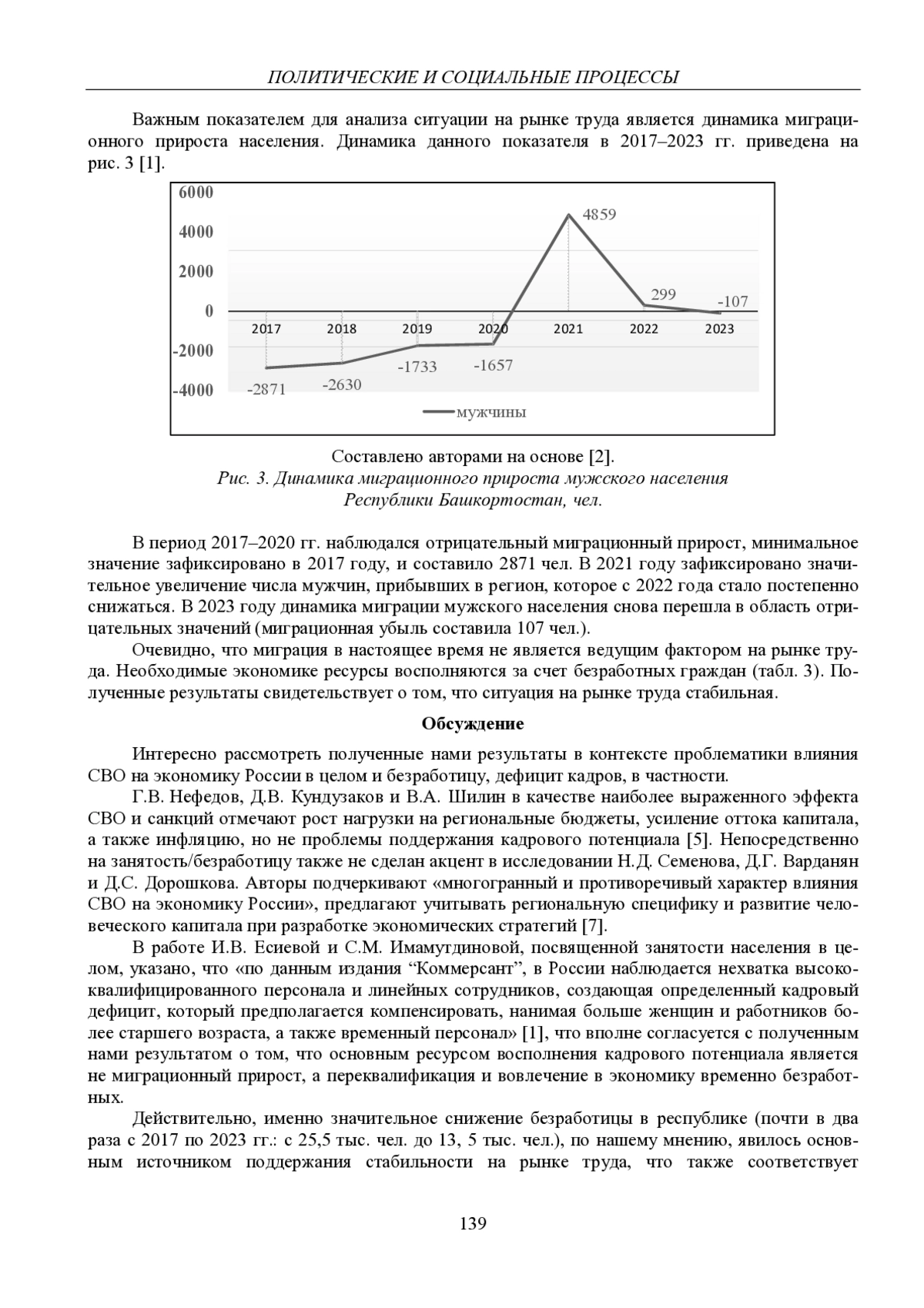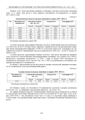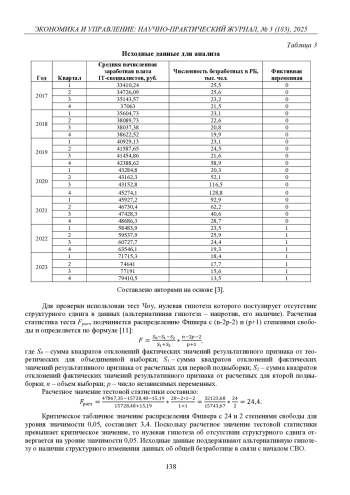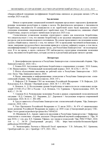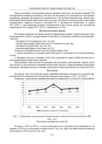 Проведено исследование эффекта влияния специальной военной операции на динамику кадрового потенциала республики. Статья подготовлена на основе данных Башкортостанстата: численность ITспециалистов, уровень среднемесячной начисленной заработной платы их труда, численность трудоспособного населения, миграционный прирост мужского населения РБ и численность безработных за период 2017–2023 гг. Проведен расчет абсолютных и относительных показателей, выполнен корреляционный анализ. Получены выводы о несостоятельности утверждения о наличии острого кадрового дефицита, об устойчивости рынка труда. При этом с помощью теста Чоу выявлено наличие структурных изменений для временного ряда численности безработных. Зафиксировано снижение уровня общей безработицы с 2017 по 2023 г. почти в два раза, что послужило источником поддержания предложения на рынке трудовых ресурсов республики
