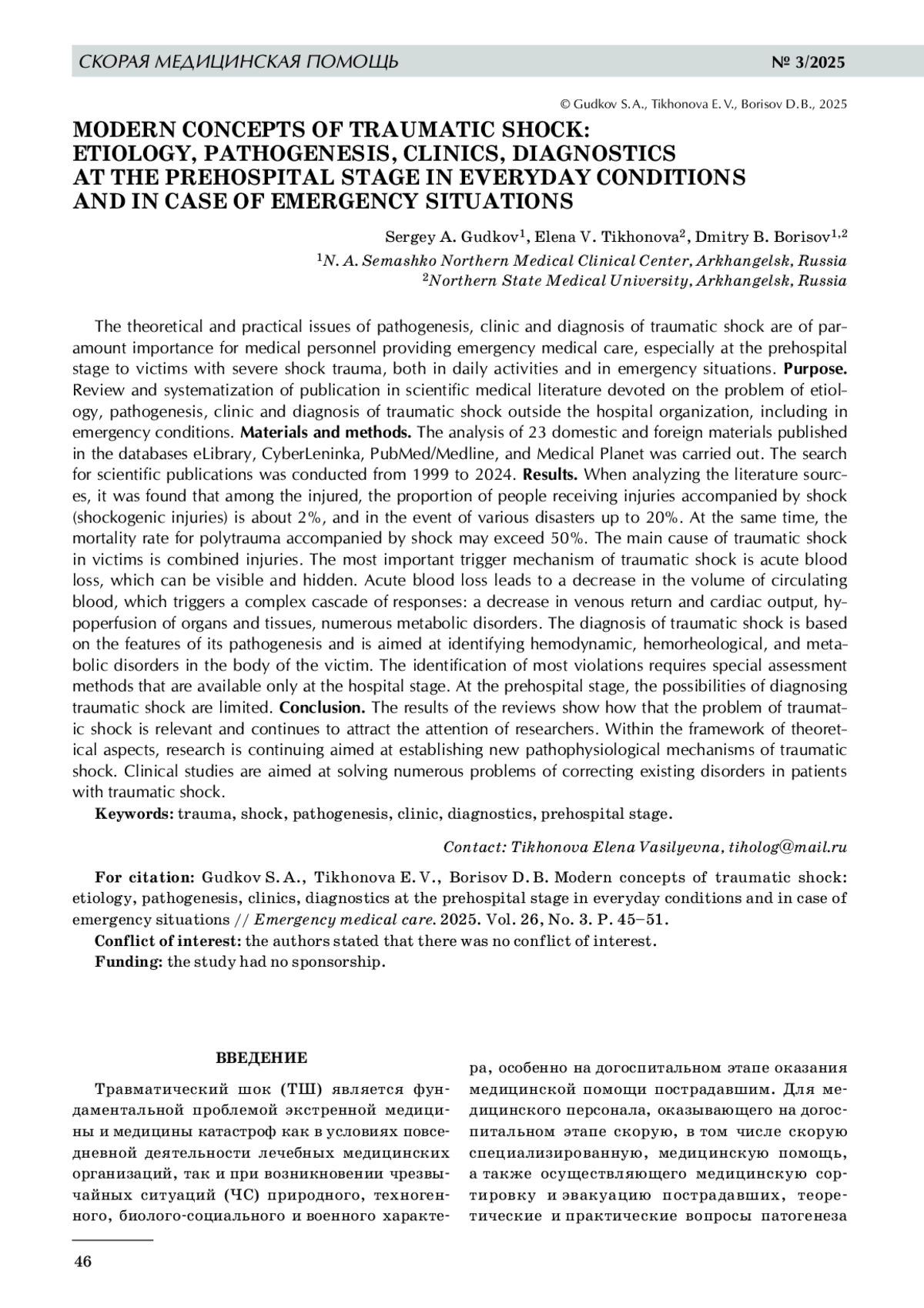 Для медицинского персонала, оказывающего скорую медицинскую помощь, особенно на догоспитальном этапе, пострадавшим с тяжелой шокогенной травмой, теоретические и практические вопросы патогенеза, клиники и диагностики травматического шока (ТШ) имеют первостепенное значение как в условиях повседневной деятельности, так и при возникновении чрезвычайных ситуаций (ЧС). Цель: представить обзор литературы по проблеме этиологии, патогенеза, клиники и диагностики травматического шока в догоспитальном периоде, в том числе в условиях ЧС. Материалы и методы исследования. Проведен анализ 23 отечественных и зарубежных источников, опубликованных в базах данных eLibrary, КиберЛенинка, PubMed/Medline, Medical Planet за период с 1999 по 2024 г. Результаты исследования. Установлено, что среди пострадавших доля лиц, получающих травмы, сопровождающиеся шоком (шокогенные травмы), составляет около 2%, а при возникновении различных катастроф и ЧС до 20%. При этом летальность, по разным оценкам, может составлять от 35 до 40%, а при политравмах, сопровождающихся шоком, может превышать 50%. Важнейший пусковой механизм ТШ — острая кровопотеря, которая может быть видимой (кровотечение из раны) и скрытой (при переломах таза и длинных трубчатых костей). Острая кровопотеря приводит к снижению объема циркулирующей крови, который запускает сложный каскад ответных реакций. Диагностика ТШ основана на особенностях его патогенеза и направлена на выявление гемодинамических, гемореологических, гипоксических и метаболических нарушений в организме пострадавшего. Для установления большинства нарушений требуются специальные методы оценки, которые доступны только на госпитальном этапе. На догоспитальном этапе возможности диагностики ТШ ограничены. Заключение. Результаты обзора показывают, что проблема ТШ является актуальной и продолжает привлекать внимание исследователей. В рамках теоретических аспектов продолжаются исследования, направленные на установление новых патофизиологических механизмов возникновения ТШ. Клинические исследования направлены на решение многочисленных задач по коррекции имеющихся нарушений у пациентов с ТШ.