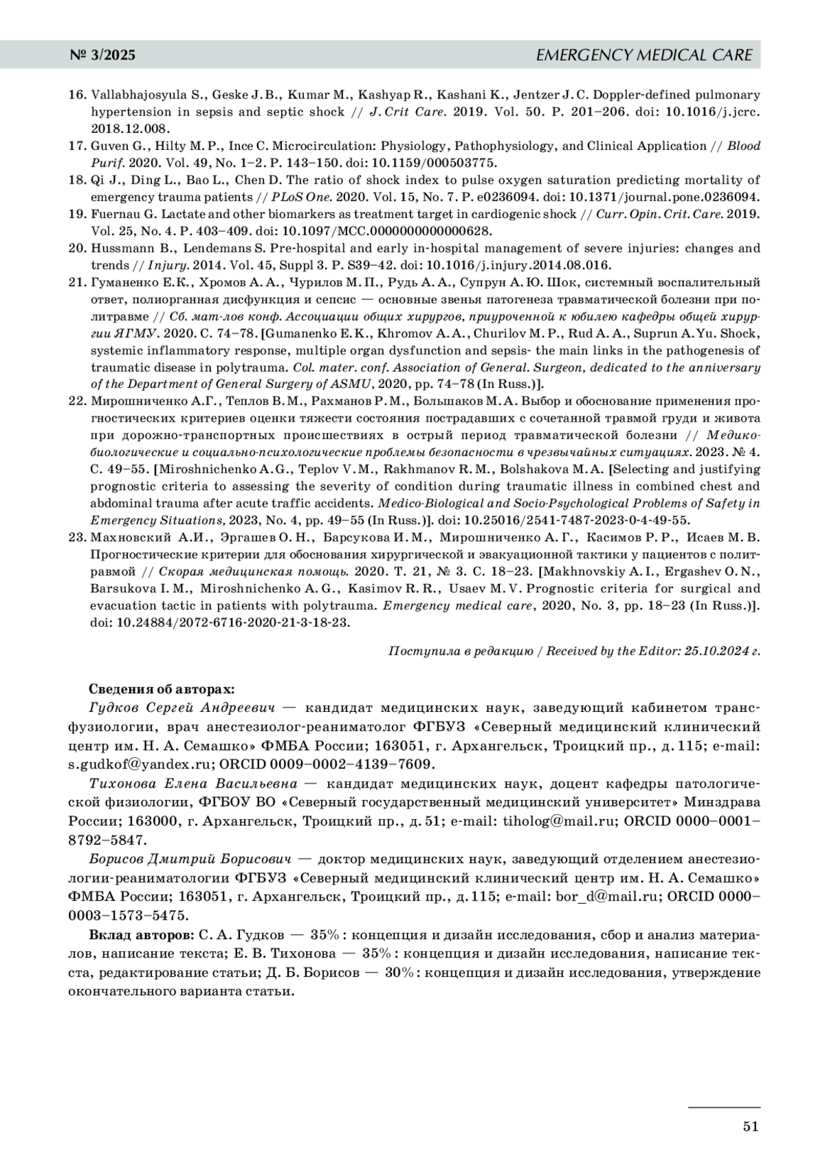 21. Гуманенко Е.К., Хромов А. А., Чурилов М. П., Рудь А. А., Супрун А. Ю. Шок, системный воспалительный ответ, полиорганная дисфункция и сепсис - основные звенья патогенеза травматической болезни при политравме // Сб. мат-лов конф. Ассоциации общих хирургов, приуроченной к юбилею кафедры общей хирургии ЯГМУ. 2020. С. 74-78.